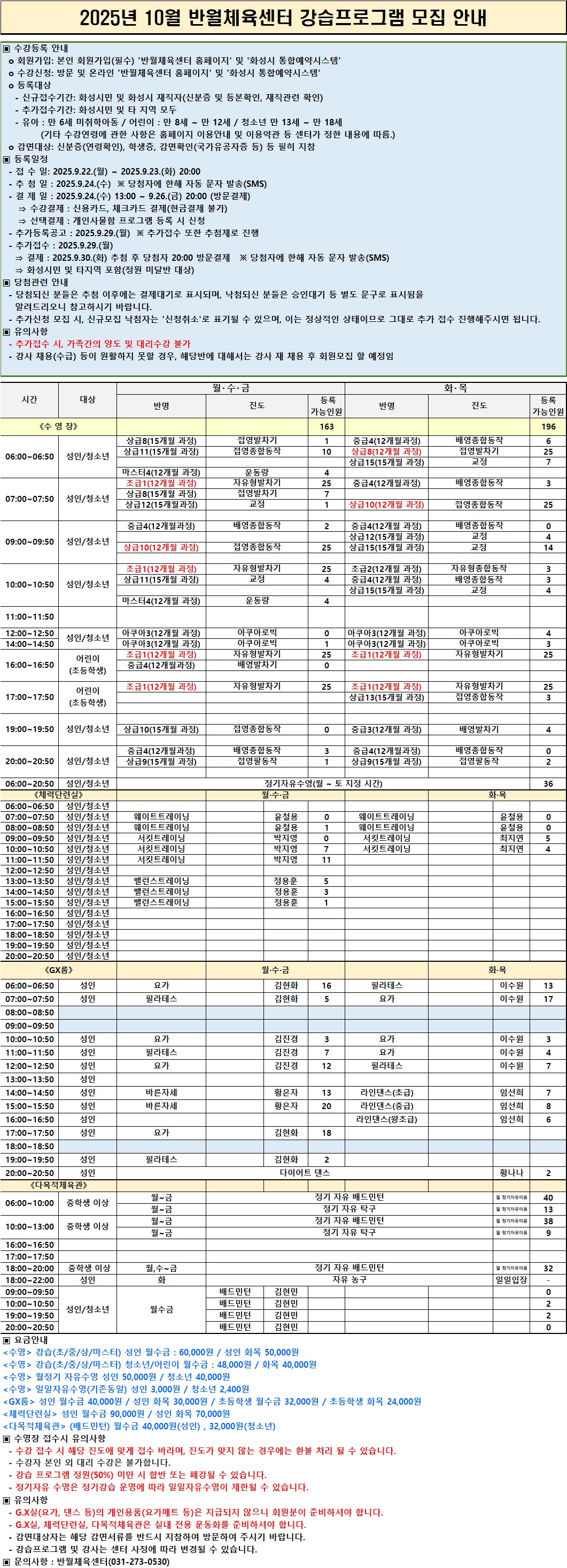 화성반월체육센터 2025년 10월 반월체육센터 강습 프로그램 모집 안내 작성자 관리자 작성일 2025년 9월 19일 10시 56분 52초 조회 2,627 2025년 10월 반월체육센터 강습프로그램 모집공고.jpg [ Size : 1.16MB, Down : 3,416 ] 미리보기 다운로드 목록보기
