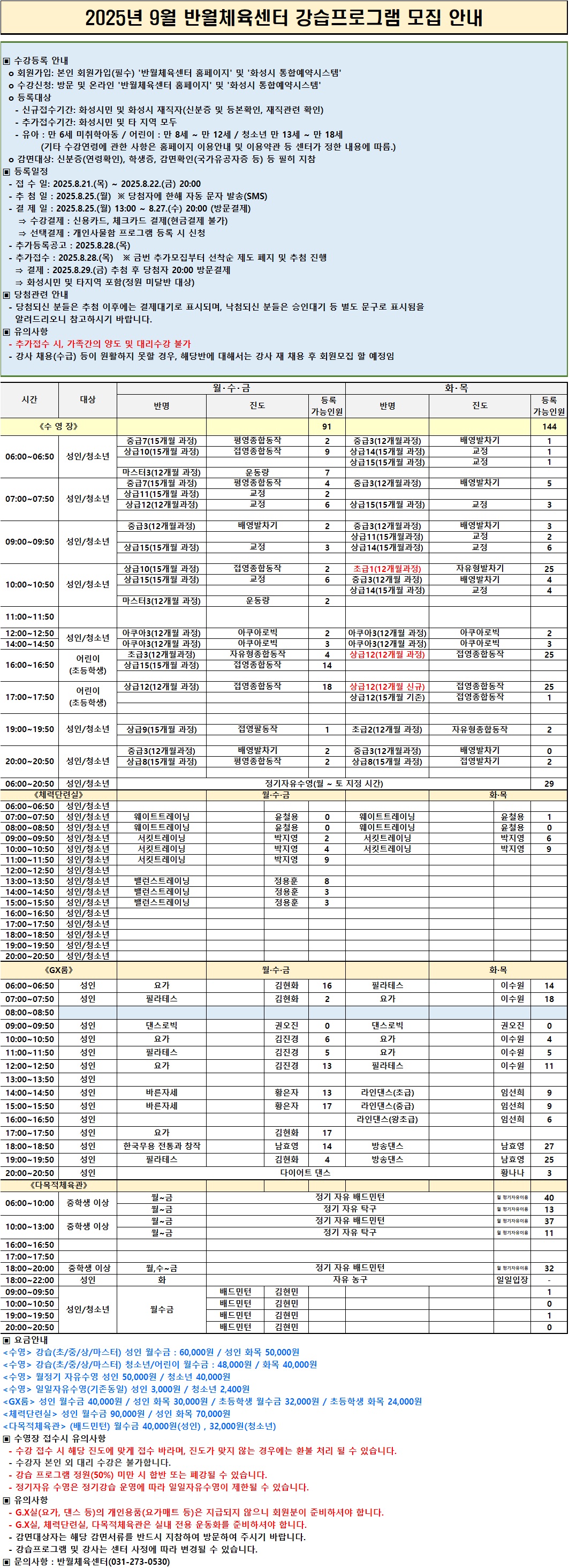 화성반월체육센터 2025년 9월 반월체육센터 강습 프로그램 모집 안내(정정) 작성자 관리자 작성일 2025년 8월 20일 17시 39분 14초 조회 2,638 2025년 9월 반월체육센터 강습프로그램 모집공고.jpg [ Size : 1.15MB, Down : 4,119 ] 미리보기 다운로드 목록보기
