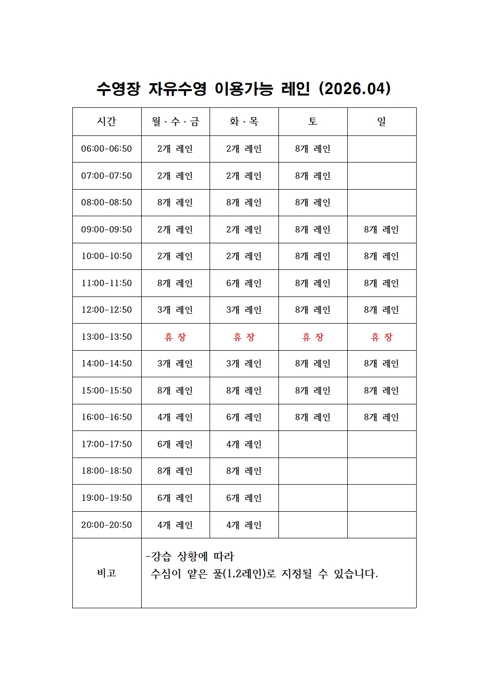 공지 화성반월체육센터 반월체육센터 2026년 4월 자유수영 이용가능 레인 안내 작성자 관리자 작성일 2026년 3월 31일 17시 58분 37초 조회 20 2026년 04월 자유수영 레인현황001.jpg [ Size : 349.72KB, Down : 20 ] 미리보기 다운로드 목록보기
