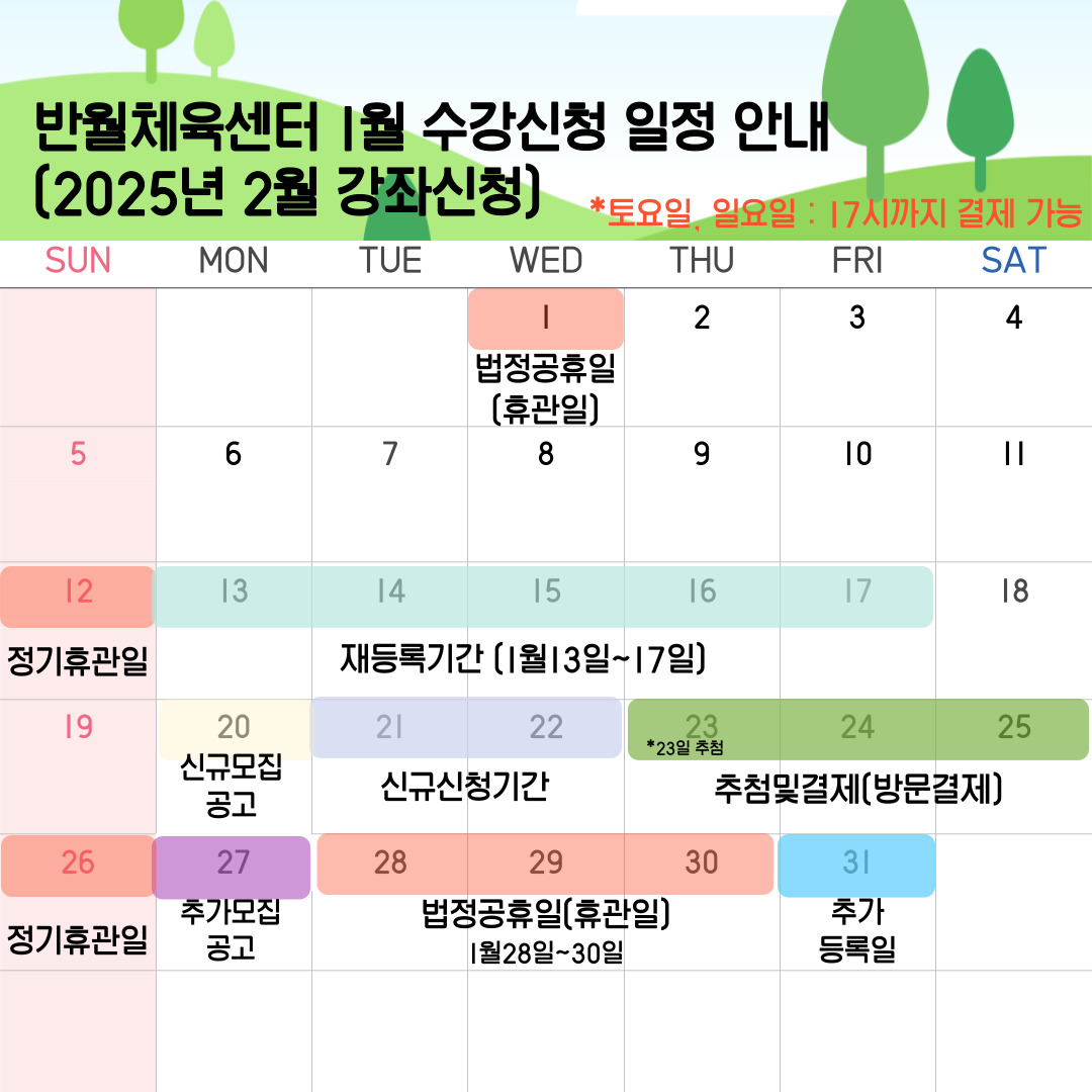 화성반월체육센터 1월(2025년2월 강좌신청) 수강신청 일정 및 휴관일 안내 작성자 관리자 작성일 2024년 12월 27일 14시 0분 11초 조회 1,232 1월 신청기간.jpg [ Size : 184.4KB, Down : 1,693 ] 미리보기 다운로드 목록보기