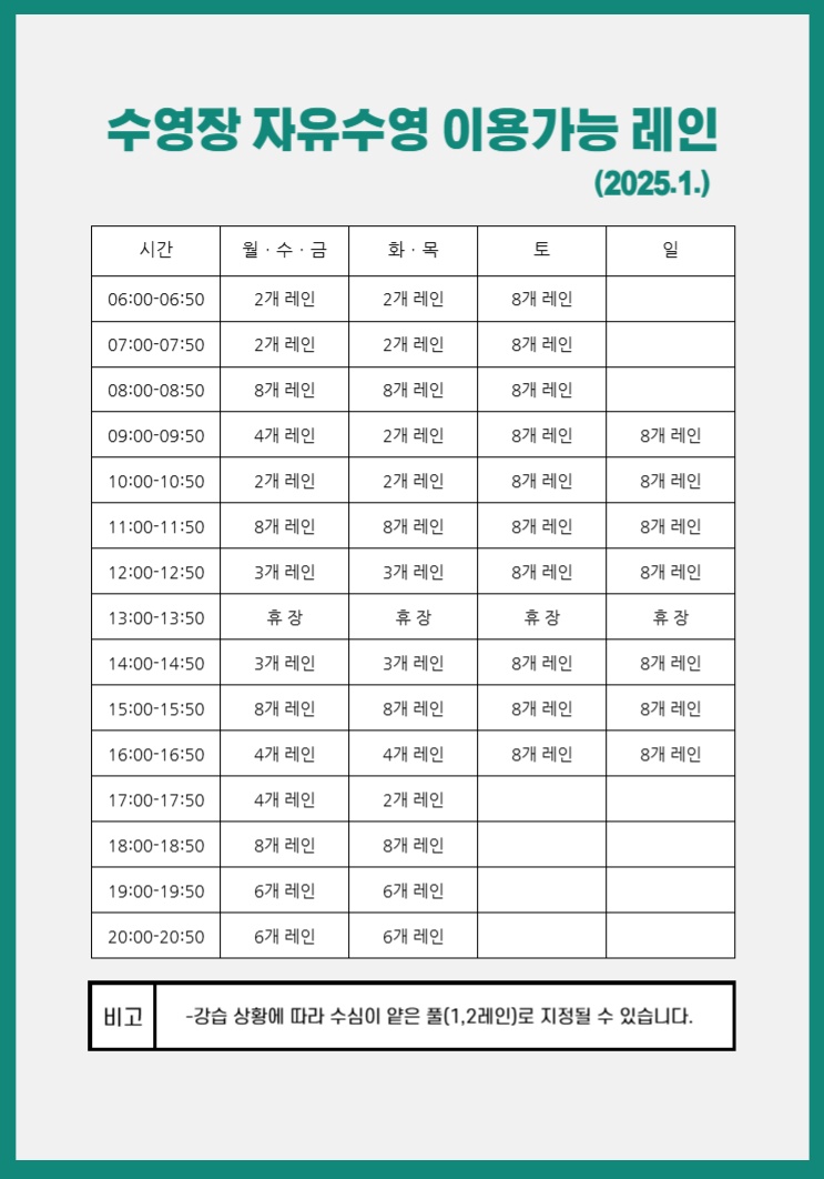 화성반월체육센터 2025년 1월 자유수영 이용가능 레인 안내 작성자 관리자 작성일 2024년 12월 27일 14시 4분 40초 조회 1,485 자유수영레인.jpg [ Size : 155.42KB, Down : 2,376 ] 미리보기 다운로드 목록보기