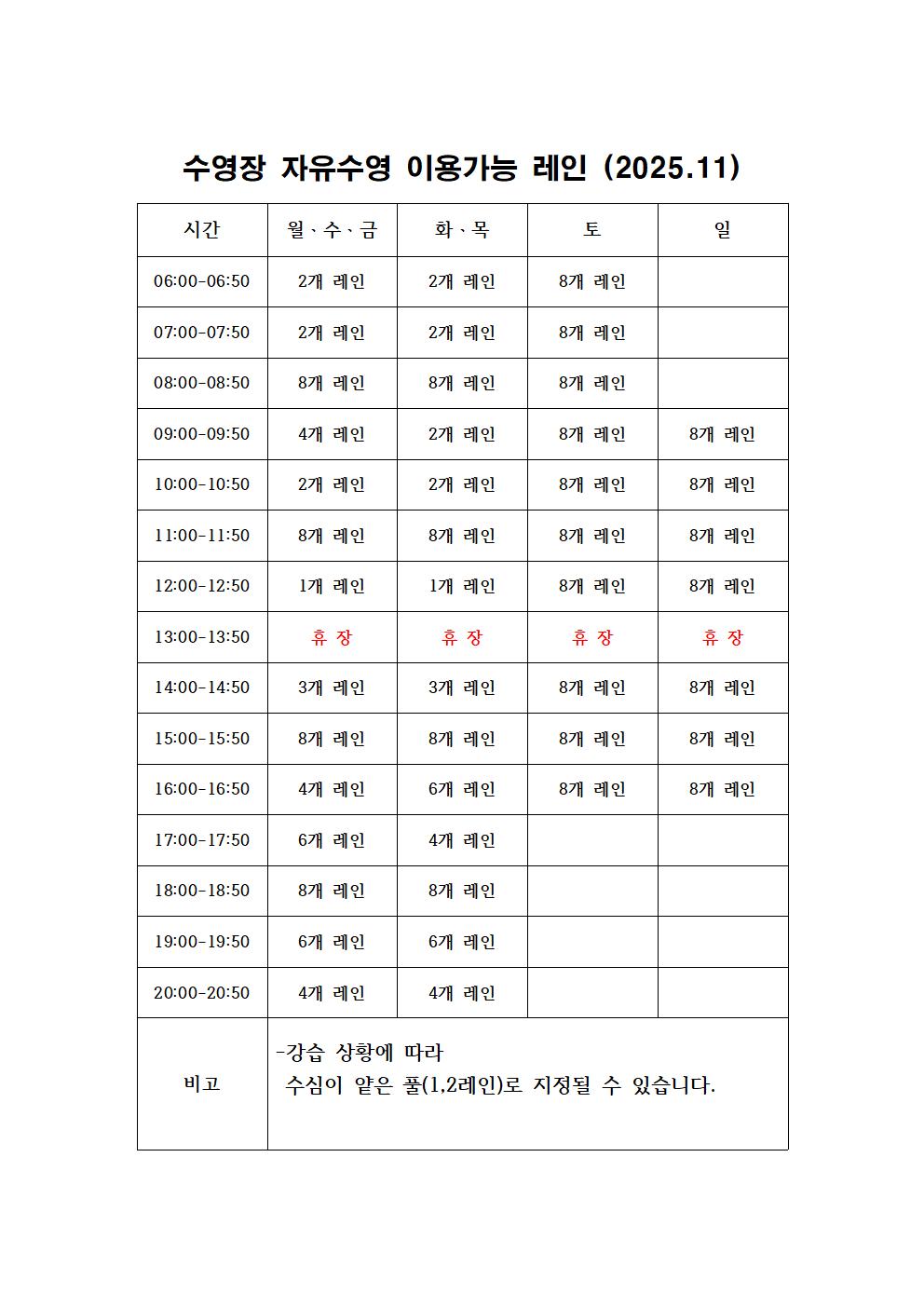 화성반월체육센터 반월체육센터 2025년 11월 자유수영 이용가능 레인 안내 작성자 관리자 작성일 2025년 10월 31일 11시 11분 22초 조회 1,037 2025년 11월 자유수영 레인현황001.jpg [ Size : 129.08KB, Down : 1,475 ] 미리보기 다운로드 목록보기