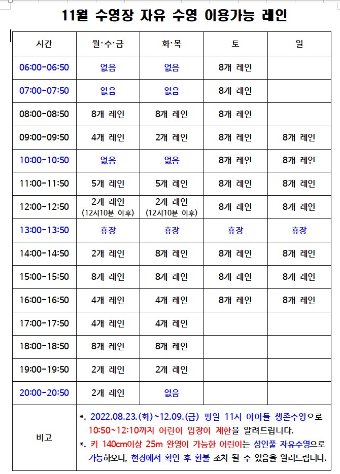 화성반월체육센터 11월 자유수영 가능레인 공지 작성자 관리자 작성일 2022년 10월 24일 10시 51분 59초 조회 2,420 11월 자유수영 이용 가능 레인2.jpg [ Size : 170.23KB, Down : 2,461 ] 미리보기 다운로드 11월 자유수영 이용 가능 레인.hwp [ Size : 15KB, Down : 542 ] 다운로드 목록보기