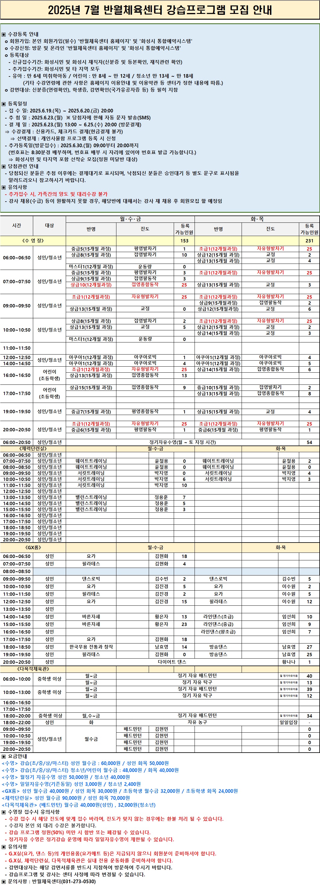 화성반월체육센터 2025년 7월 반월체육센터 강습프로그램 모집 안내(정정) 작성자 관리자 작성일 2025년 6월 18일 11시 30분 47초 조회 2,680 2025년 7월 반월체육센터 강습프로그램 모집공고(정정).jpg [ Size : 1.14MB, Down : 5,174 ] 미리보기 다운로드 목록보기