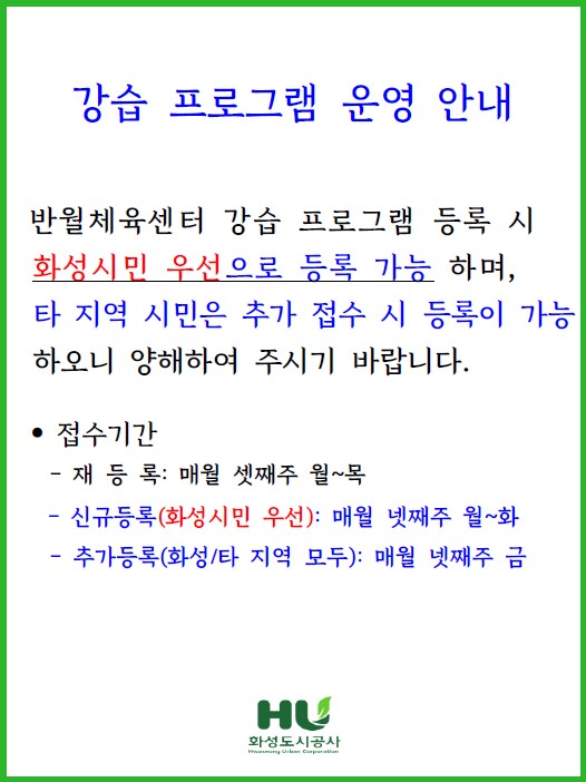 공지 화성반월체육센터 반월체육센터 강습 프로그램 운영 안내 작성자 관리자 작성일 2022년 6월 9일 10시 8분 19초 조회 3,861 반월체육센터 강습 프로그램 운영 안내.hwp [ Size : 17.5KB, Down : 2,597 ] 다운로드 강습 프로그램 운영 안내.jpg [ Size : 75.72KB, Down : 4,401 ] 미리보기 다운로드 목록보기