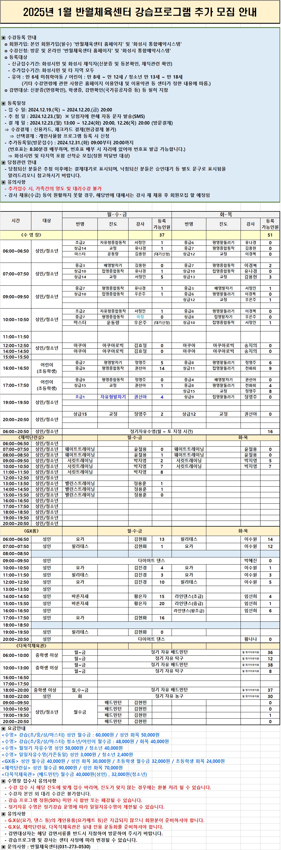 화성반월체육센터 2025년 1월 반월체육센터 강습프로그램 추가 모집 안내 작성자 관리자 작성일 2024년 12월 30일 13시 37분 2초 조회 2,335 1월 강습프로그램 추가 모집안내.jpg [ Size : 1.12MB, Down : 989 ] 미리보기 다운로드 목록보기