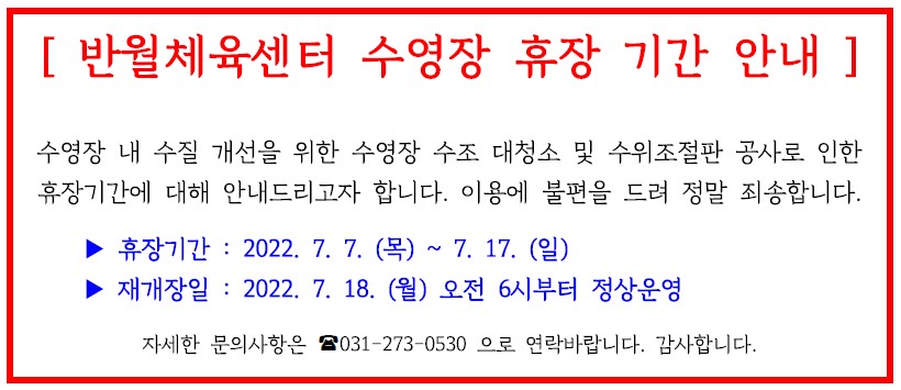 화성반월체육센터 <반월체육센터 수영장 긴급휴장안내> 작성자 관리자 작성일 2022년 7월 5일 18시 10분 47초 조회 1,817 1313.jpg [ Size : 78.19KB, Down : 1,350 ] 미리보기 다운로드 목록보기