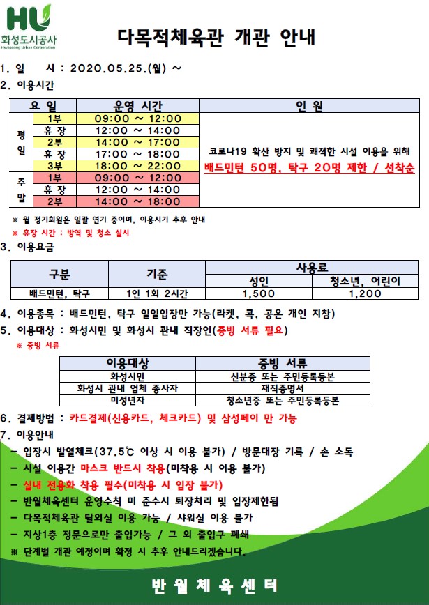 화성반월체육센터 반월체육센터 이용안내 (2020. 5. 25. ~) 작성자 관리자 작성일 2020년 5월 23일 13시 40분 17초 조회 1,447 다목적체육관 개관 안내(수정3).jpg [ Size : 152.49KB, Down : 353 ] 미리보기 다운로드 수정사항1. 2020.05.25.(월) : 이용요금 내용 추가2. 2020.05.26.(화) : 결제방법 내용 추가3. 2020.05.27.(수) : 이용자 증빙서류 내용, 제한 인원 추가 목록보기