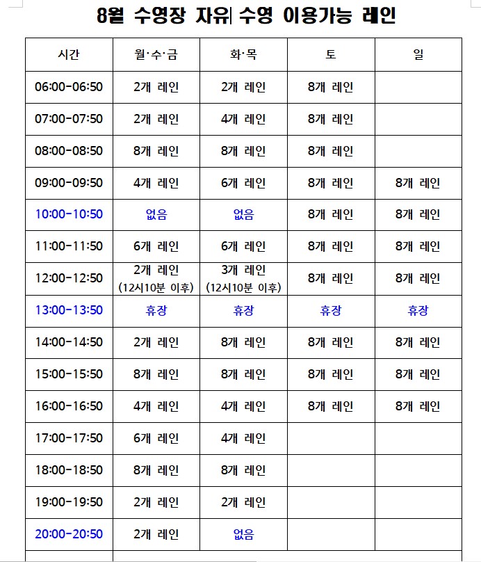 화성반월체육센터 8월 자유수영 가능레인 공지 작성자 관리자 작성일 2022년 7월 29일 16시 10분 26초 조회 2,228 8월 자유수영 이용 가능 레인.jpg [ Size : 137.08KB, Down : 3,407 ] 미리보기 다운로드 8월 자유수영 이용 가능 레인.hwp [ Size : 14KB, Down : 675 ] 다운로드 목록보기