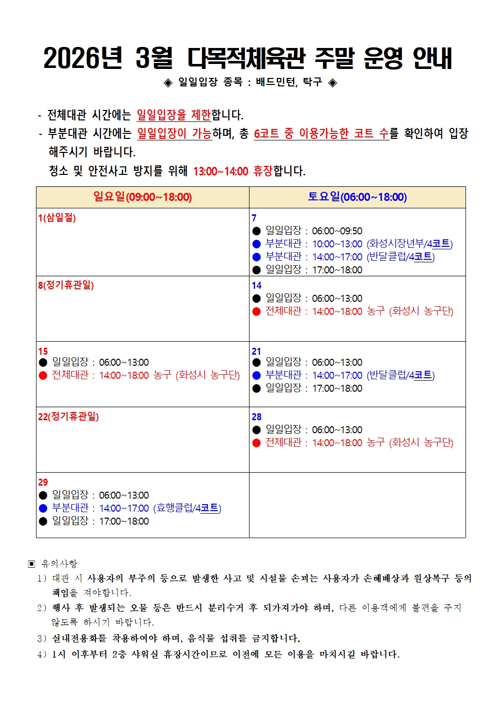 공지 화성반월체육센터 2026년 3월 다목적체육관 주말운영안내 작성자 관리자 작성일 2026년 2월 27일 11시 20분 57초 조회 439 2026년 3월 다목적체육관 주말 운영 안내001.jpg [ Size : 551.75KB, Down : 737 ] 미리보기 다운로드 목록보기
