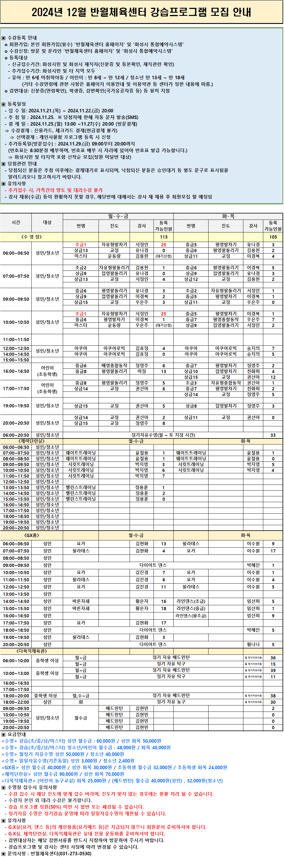 화성반월체육센터 2024년 12월 반월체육센터 강습프로그램 모집 공고 작성자 관리자 작성일 2024년 11월 20일 16시 7분 36초 조회 2,153 2024년 12월 반월체육센터 강습프로그램 모집 안내.png [ Size : 241.11KB, Down : 4,418 ] 미리보기 다운로드 목록보기