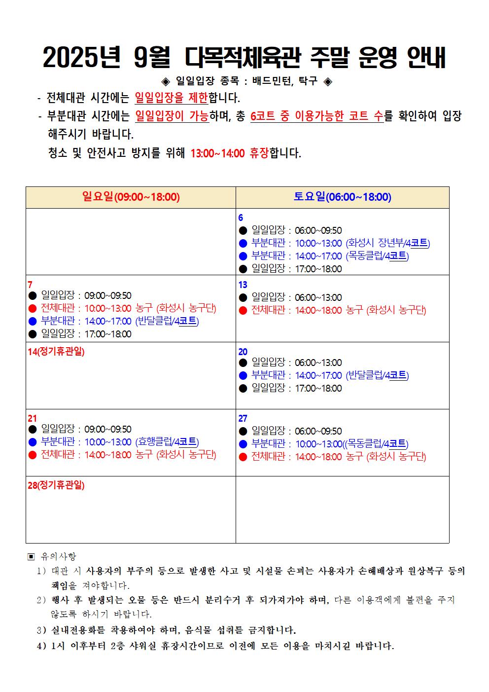 화성반월체육센터 2025년 9월 다목적체육관 주말운영안내 작성자 관리자 작성일 2025년 9월 1일 16시 49분 58초 조회 1,227 2025년 9월 다목적체육관 주말 운영 안내001.jpg [ Size : 182.39KB, Down : 1,502 ] 미리보기 다운로드 목록보기