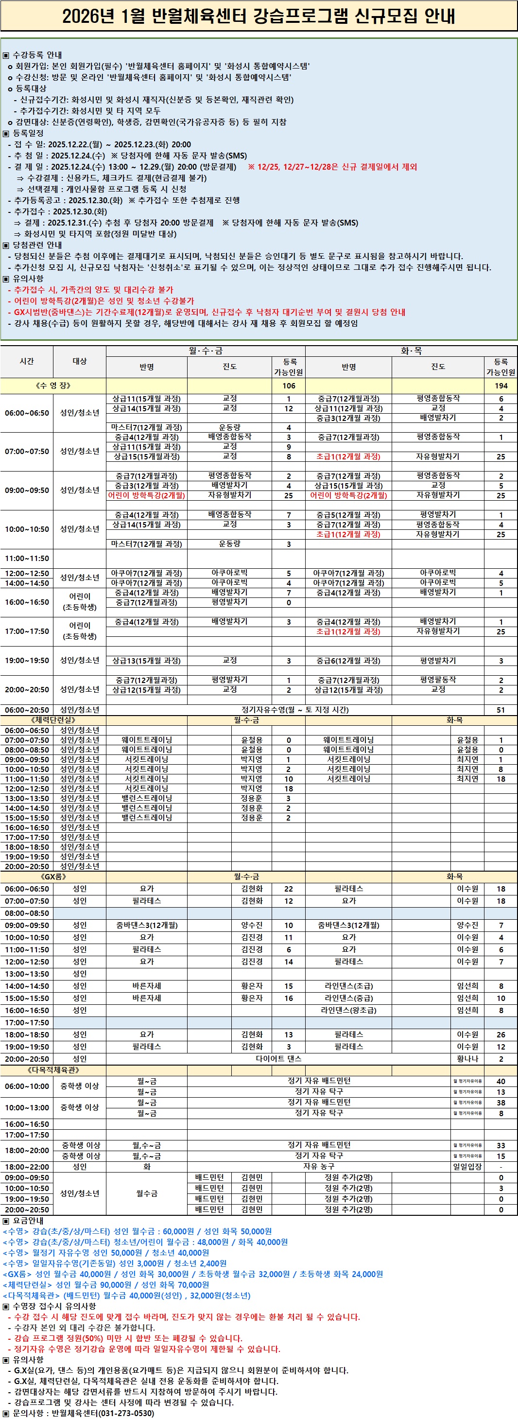 화성반월체육센터 2026년 1월 반월체육센터 강습 프로그램 모집 안내 작성자 관리자 작성일 2025년 12월 22일 11시 53분 44초 조회 2,252 1월 모집공고.JPG [ Size : 1.19MB, Down : 2,684 ] 미리보기 다운로드 목록보기