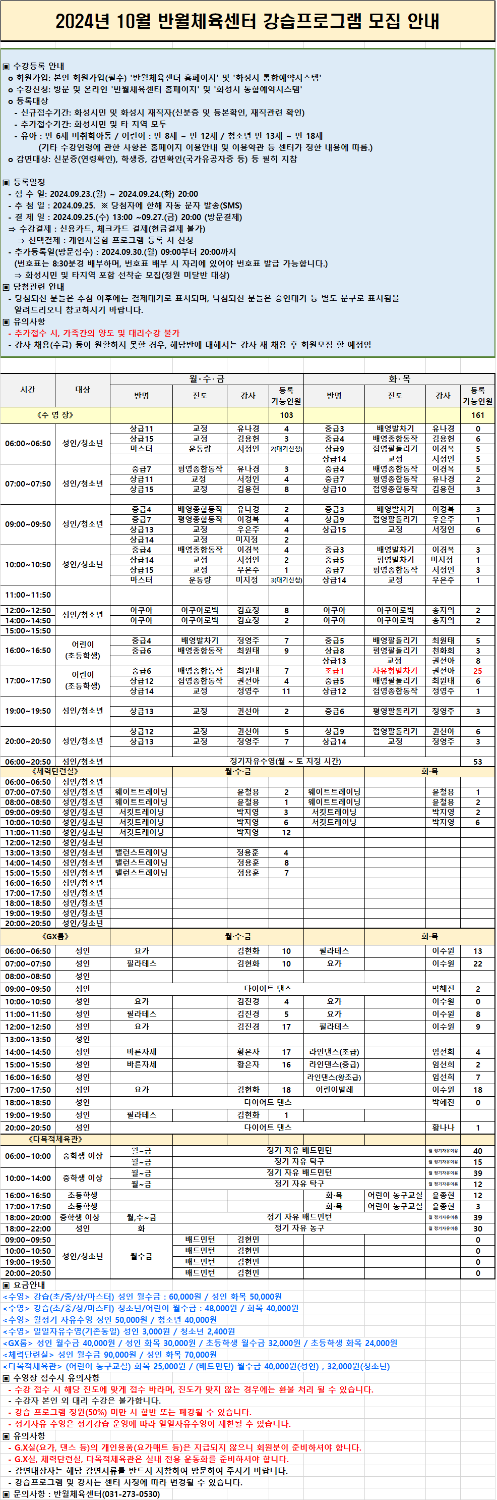 화성반월체육센터 2024년 10월 반월체육센터 강습프로그램 모집 공고(정정) 작성자 관리자 작성일 2024년 9월 20일 17시 42분 33초 조회 2,976 2024년 10월 반월체육센터 강습프로그램 모집공고(9월 접수)_0921.png [ Size : 253.88KB, Down : 5,404 ] 미리보기 다운로드 목록보기