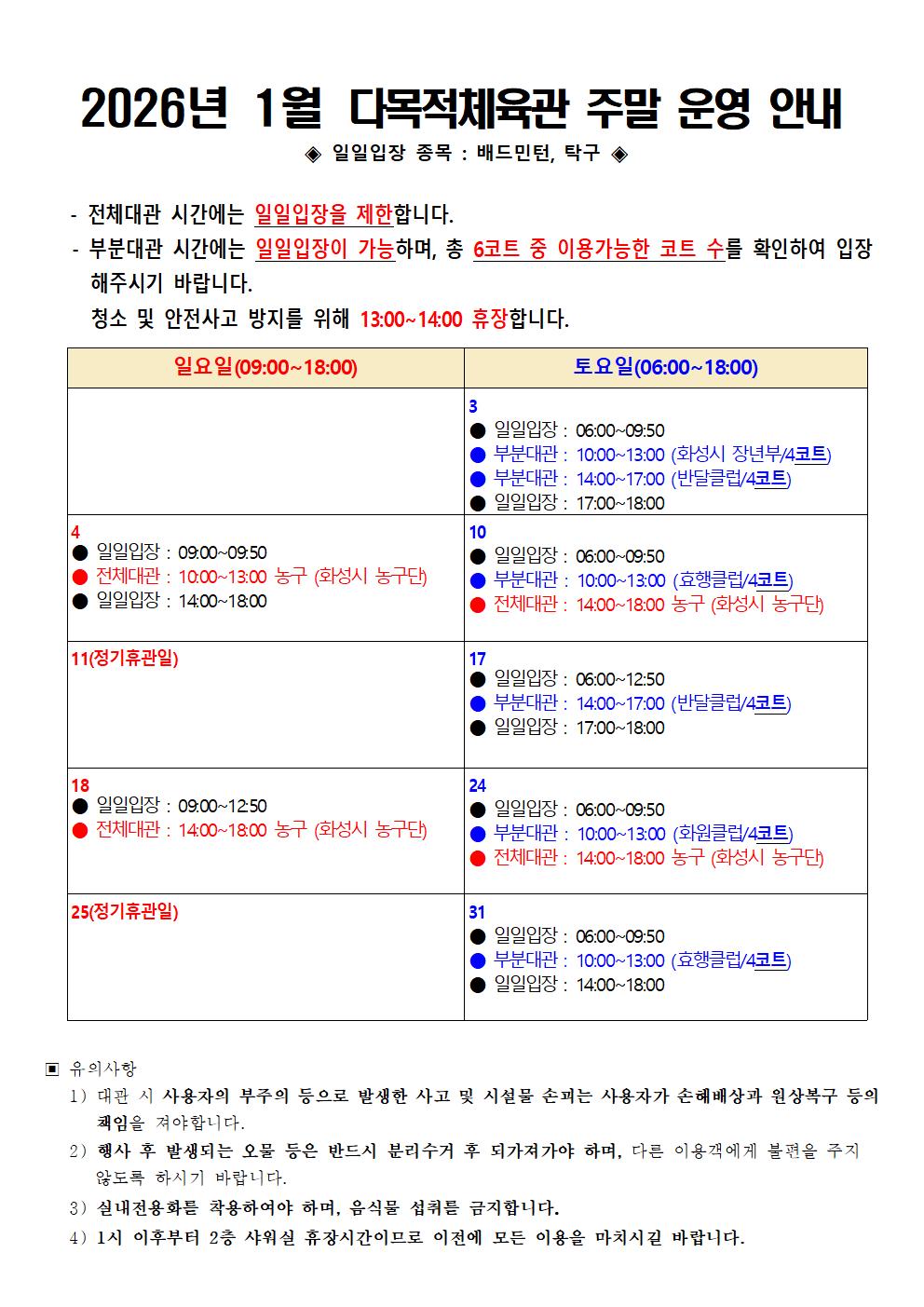 공지 화성반월체육센터 2026년 1월 다목적체육관 주말운영안내 작성자 관리자 작성일 2025년 12월 30일 9시 8분 16초 조회 110 2026년 1월 다목적체육관 주말 운영 안내001.jpg [ Size : 187.37KB, Down : 135 ] 미리보기 다운로드 목록보기