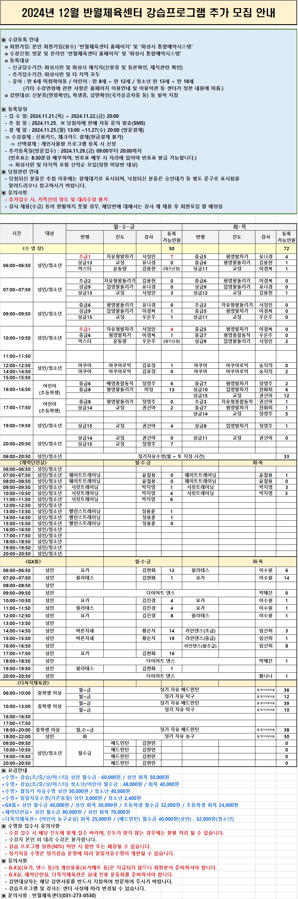화성반월체육센터 2024년 12월 강습프로그램 추가 모집 공고 작성자 관리자 작성일 2024년 11월 28일 16시 36분 15초 조회 1,632 12월 추가모집공고.jpg [ Size : 1.14MB, Down : 3,068 ] 미리보기 다운로드 목록보기