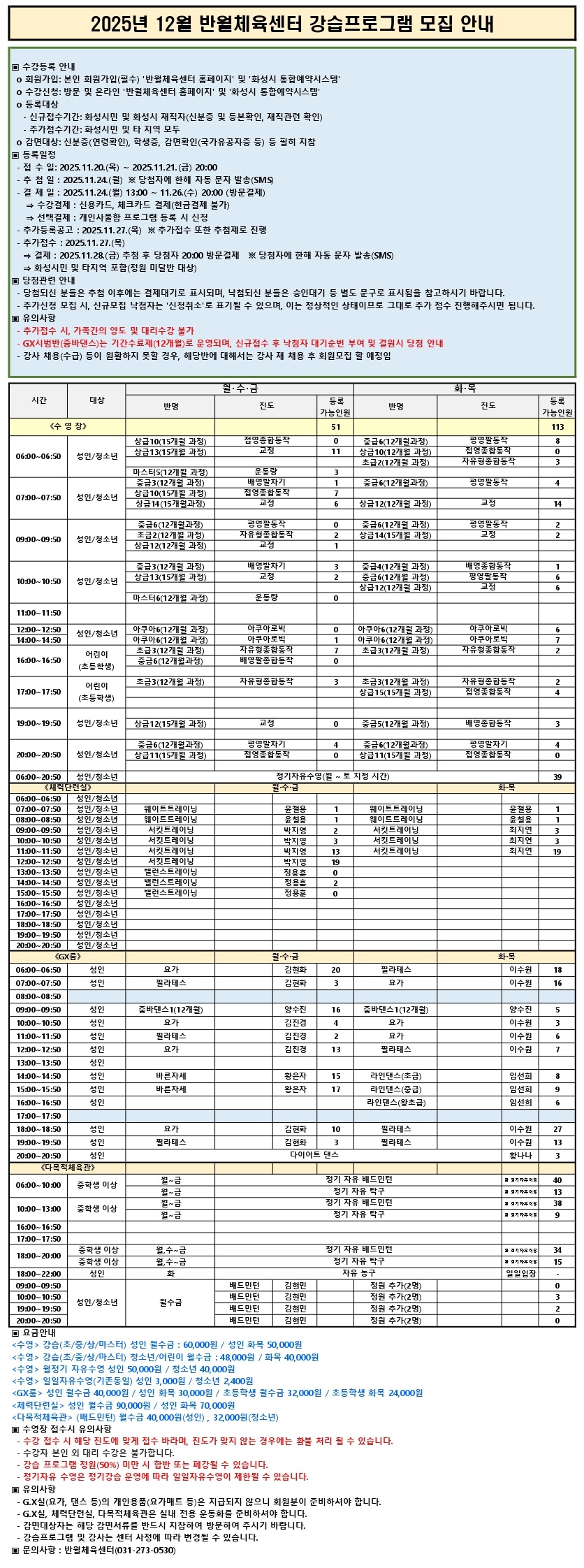 화성반월체육센터 2025년 12월 반월체육센터 강습 프로그램 모집 안내 작성자 관리자 작성일 2025년 11월 19일 13시 53분 37초 조회 2,020 2025년 12월 반월체육센터 강습프로그램 모집공고1.jpg [ Size : 725.61KB, Down : 2,923 ] 미리보기 다운로드 목록보기