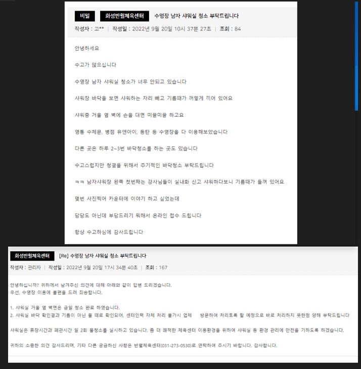 22년 9월경에도 남자 샤워장 바닥청소 문제를 제기하였습니다 23년 현재도 너무 불결합니다. 직원분들 잘못은 아니지요 운영하시는 대표자가 인건비 아끼려 상주인원 채용을 안해서 이지경이라 생각합니다 바닥뿐 아니라 벽, 천정, 배수로 등 정말 불결 합니다 매일 수영하며 먹을 수 밖에 없는 수영장 물이 샤워장 바닥부터 이렇게 오염 되있으니 답답하군요 이번에도 물때라 하지 마시고 , 물때가 이정도면 청소를 안한다는 이야기 같습니다 여자 샤워실은 깨끗한지 아내가 수영을 안하니 모르겠고 빠른 조치가 필요할 듯 합니다
