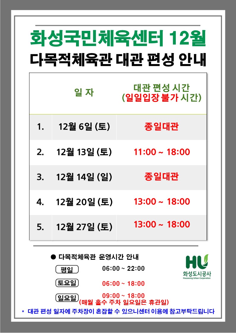 공지 화성국민체육센터 화성국민체육센터 12월 다목적체육관 대관 일정 안내 작성자 관리자 작성일 2025년 12월 1일 13시 36분 16초 조회 411 대관 안내문(12월).JPG [ Size : 157.4KB, Down : 509 ] 미리보기 다운로드 목록보기