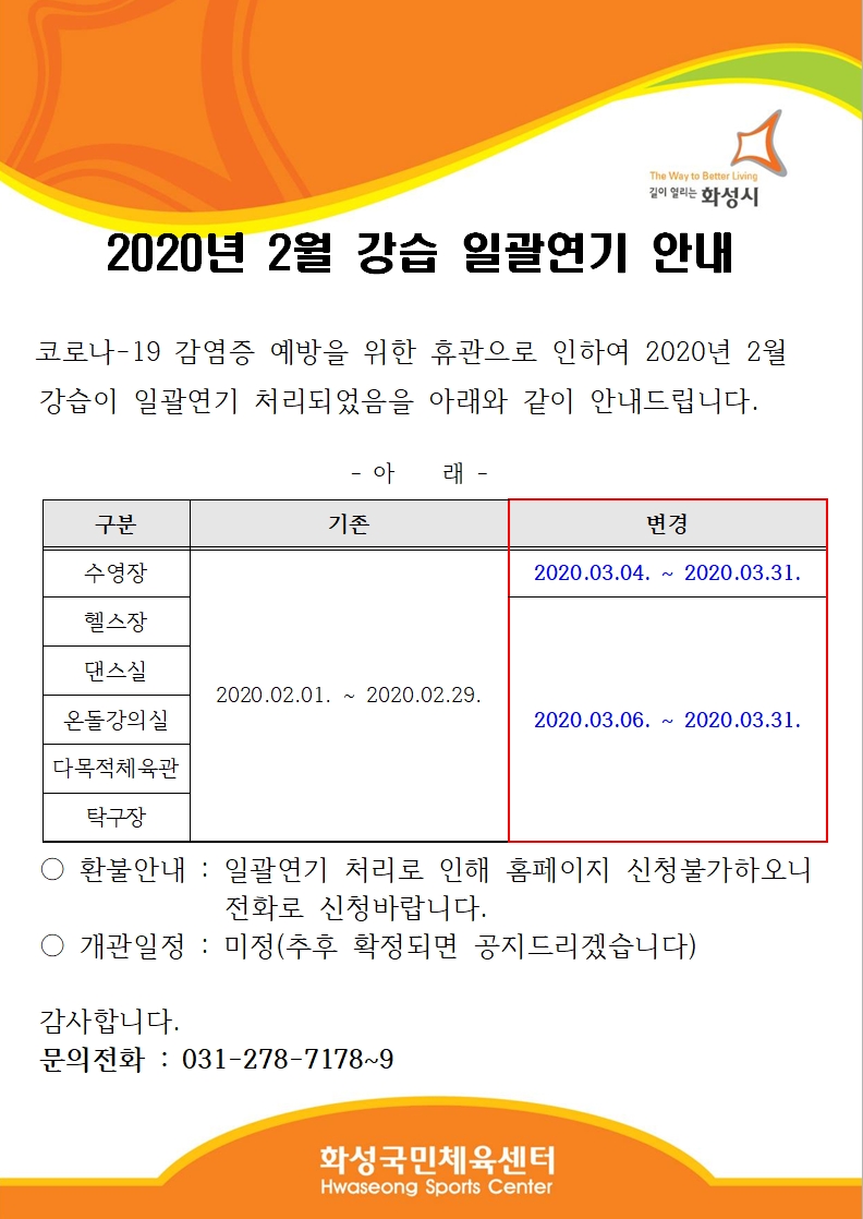 화성국민체육센터 2020년 2월 강습 일괄연기 안내 작성자 관리자 작성일 2020년 2월 28일 10시 33분 38초 조회 1,115 2월 강습 일괄연기 안내.jpg [ Size : 324.1KB, Down : 996 ] 미리보기 다운로드 목록보기