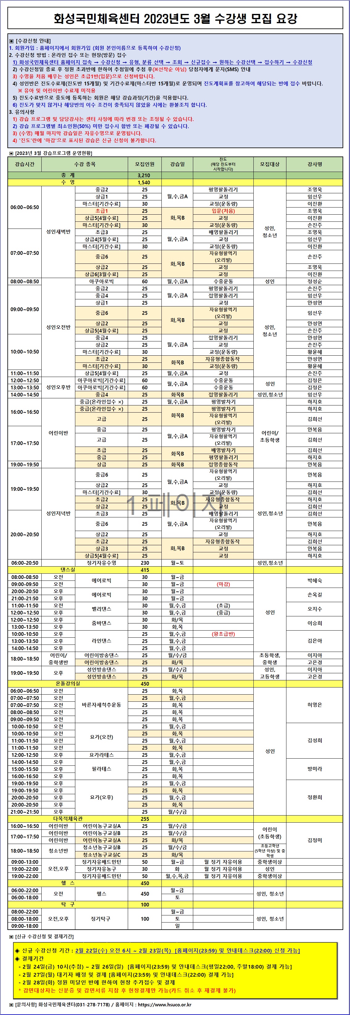 화성국민체육센터 화성국민체육센터 2023년 3월 수강생 모집요강 작성자 관리자 작성일 2023년 2월 21일 17시 35분 39초 조회 2,455 화성국민체육센터 2023년 3월 수강생 모집요강.jpg [ Size : 1.23MB, Down : 4,706 ] 미리보기 다운로드 목록보기