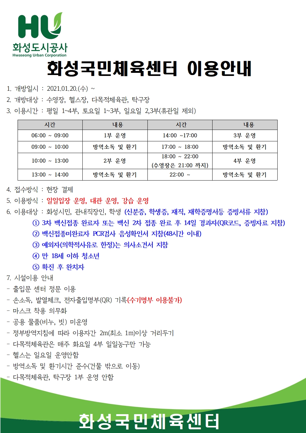 화성국민체육센터 화성국민체육센터 재개관 안내( 수정) 작성자 관리자 작성일 2021년 2월 1일 14시 32분 56초 조회 3,107 센터 운영시간 안내문(22시)001.jpg [ Size : 573.93KB, Down : 2,060 ] 미리보기 다운로드 목록보기