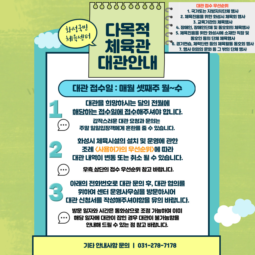 공지 화성국민체육센터 화성국민체육센터 다목적체육관 대관 접수 안내 작성자 관리자 작성일 2022년 6월 23일 17시 8분 46초 조회 1,631 대관안내문-001.jpg [ Size : 344.82KB, Down : 1,922 ] 미리보기 다운로드 목록보기