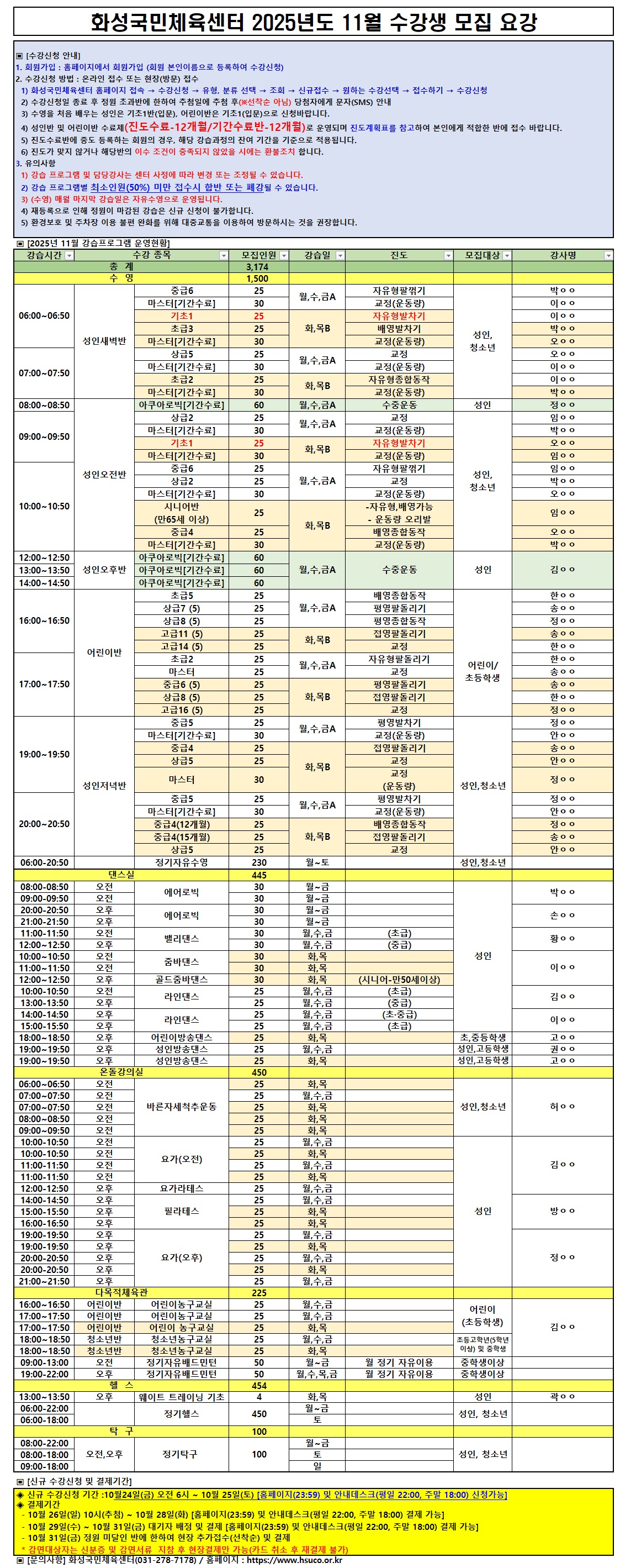 화성국민체육센터 화성국민체육센터 2025년 11월 수강생 모집 요강 작성자 관리자 작성일 2025년 10월 23일 9시 42분 17초 조회 1,273 2025년도 11월 화성국민체육센터 프로그램 모집요강.jpg [ Size : 1.16MB, Down : 2,472 ] 미리보기 다운로드 목록보기