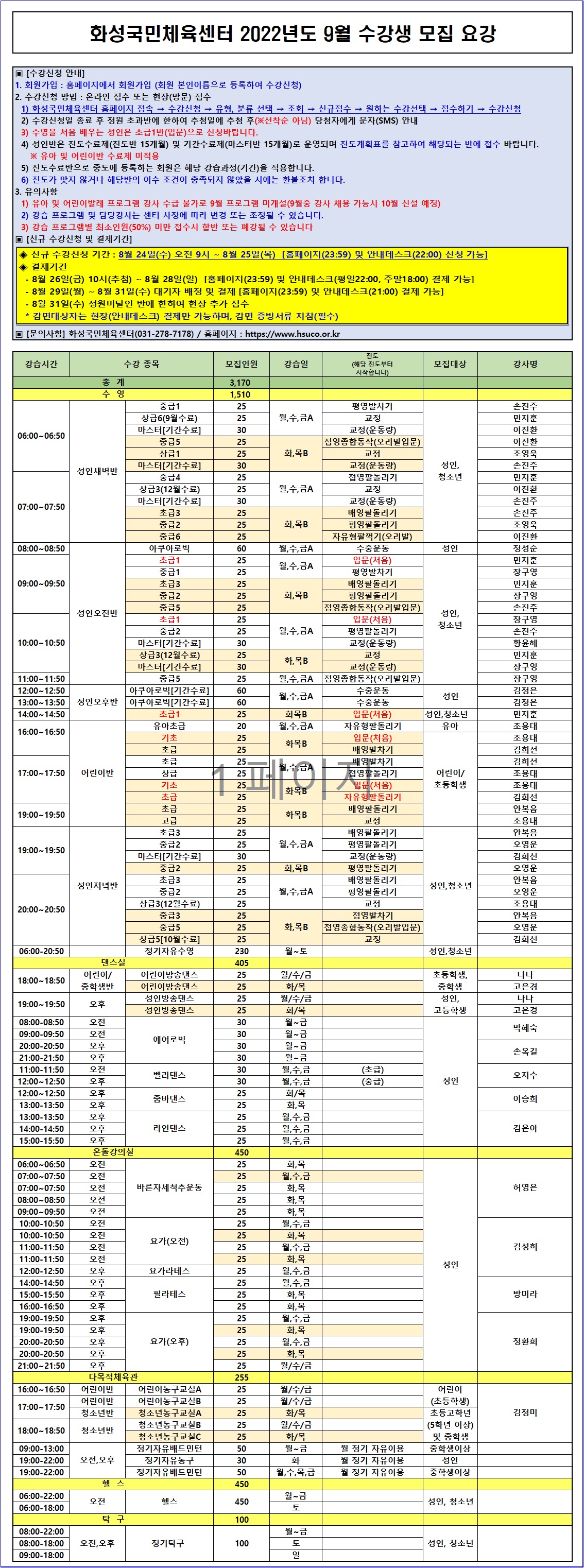 화성국민체육센터 화성국민체육센터 2022년도 9월 수강생 모집요강 작성자 관리자 작성일 2022년 8월 23일 10시 37분 6초 조회 2,733 화성국민체육센터 2022년도 9월 수강생 모집요강.jpg [ Size : 1.21MB, Down : 4,971 ] 미리보기 다운로드 목록보기