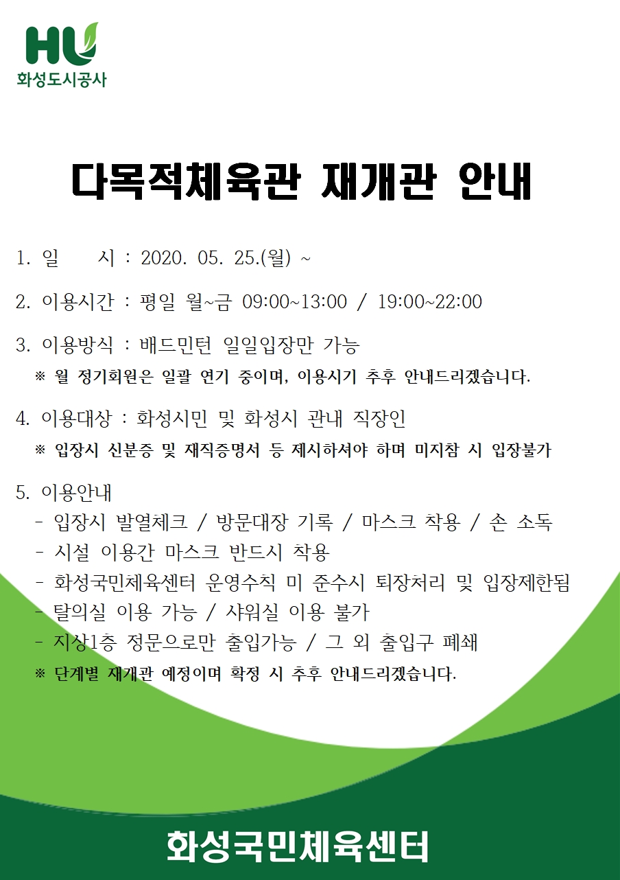 화성국민체육센터 다목적체육관 재개관 안내 작성자 관리자 작성일 2020년 5월 22일 16시 33분 22초 조회 2,032 다목적체육관 재개관 안내.jpg [ Size : 412.21KB, Down : 2,565 ] 미리보기 다운로드 목록보기
