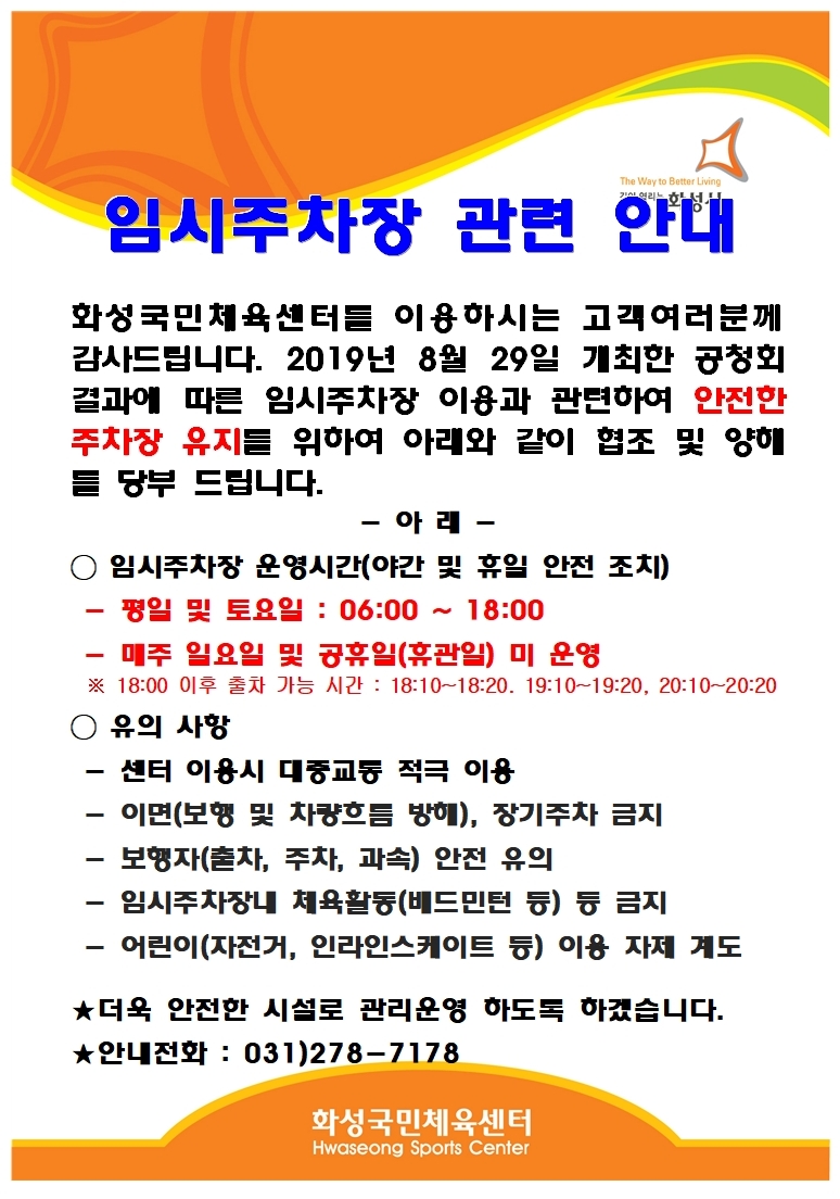 화성국민체육센터 임시주차장 운영 관련 안내 작성자 관리자 작성일 2019년 10월 2일 9시 9분 38초 조회 1,147 20190904_임시주차장 관련 안내 팝업.jpg [ Size : 428.57KB, Down : 1,465 ] 미리보기 다운로드 목록보기