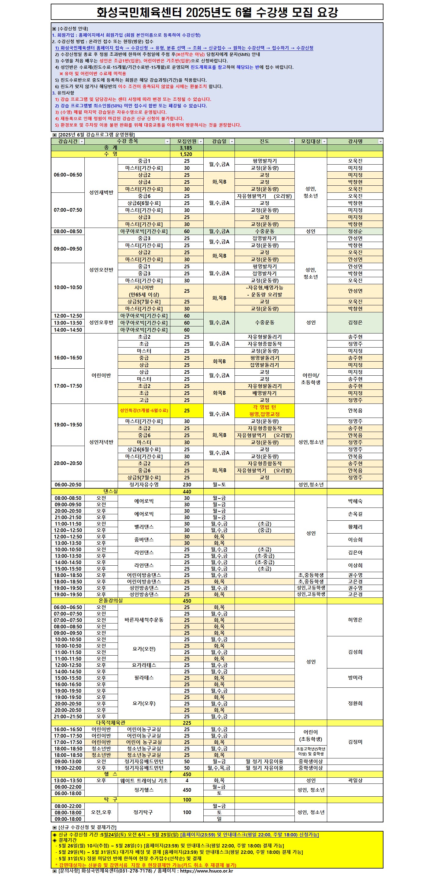 화성국민체육센터 화성국민체육센터 2025년 6월 수강생 모집 요강 작성자 관리자 작성일 2025년 5월 21일 16시 22분 54초 조회 2,421 2025년도 6월 화성국민체육센터 프로그램 모집요강.jpg [ Size : 1000.98KB, Down : 4,677 ] 미리보기 다운로드 목록보기