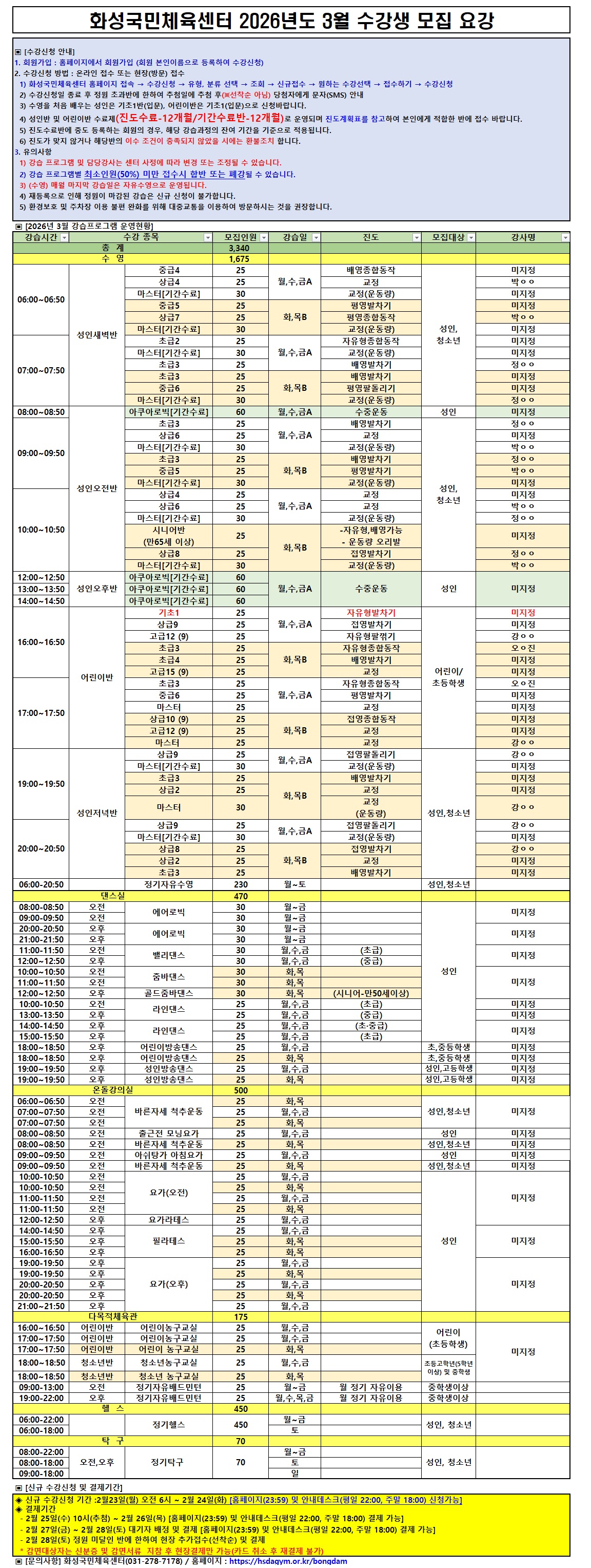 공지 화성국민체육센터 2026년도 3월 화성국민체육센터 프로그램 모집 요강 작성자 관리자 작성일 2026년 2월 21일 10시 43분 26초 조회 1,384 2026년도 3월 화성국민체육센터 프로그램 모집요강.jpg [ Size : 1.24MB, Down : 2,867 ] 미리보기 다운로드 목록보기