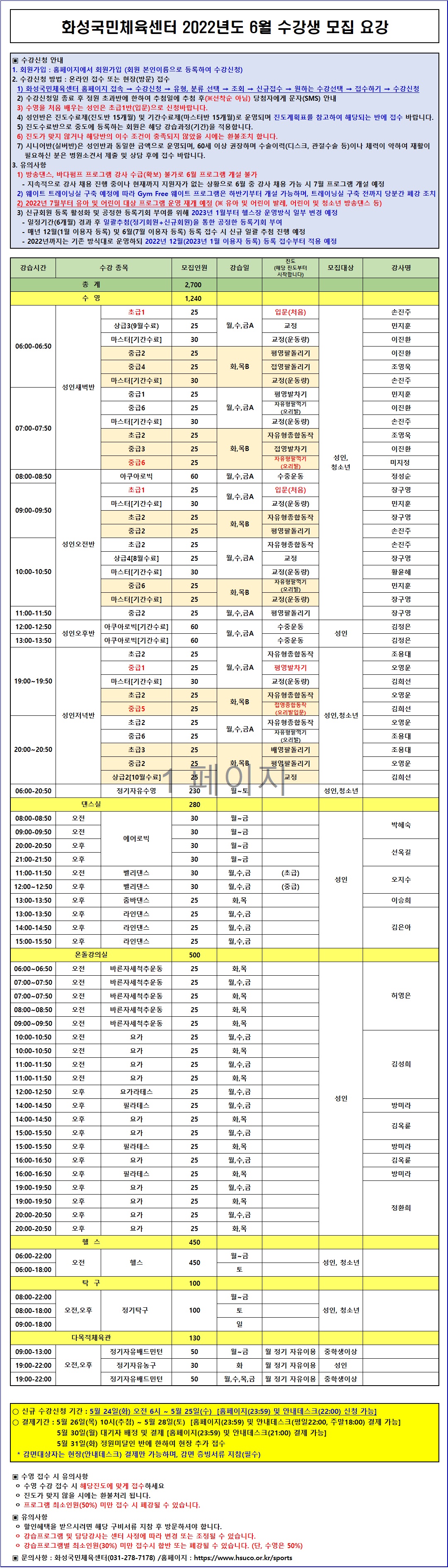 화성국민체육센터 화성국민체육센터 2022년도 6월 수강생 모집요강 작성자 관리자 작성일 2022년 5월 23일 16시 50분 1초 조회 2,311 화성국민체육센터 2022년도 6월 수강생 모집요강.jpg [ Size : 1.26MB, Down : 3,863 ] 미리보기 다운로드 목록보기