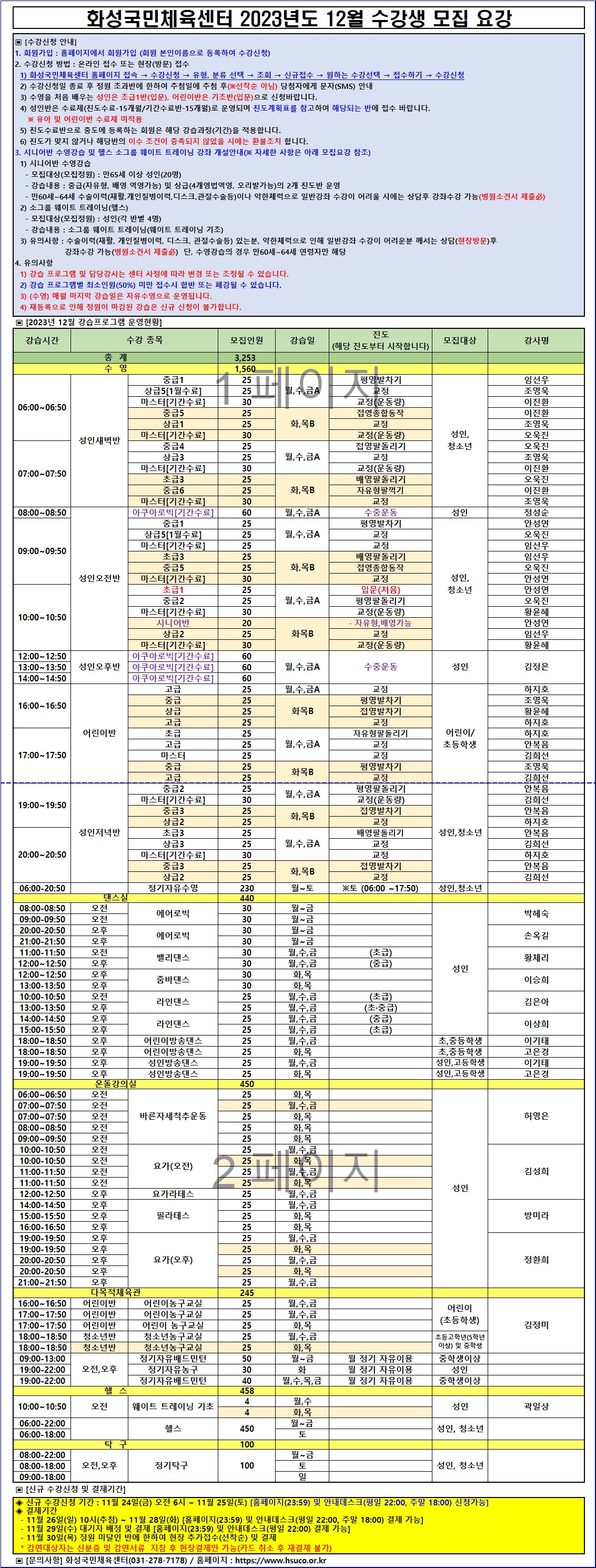 화성국민체육센터 화성국민체육센터 2023년도 12월 수강생 모집요강 작성자 관리자 작성일 2023년 11월 23일 17시 25분 51초 조회 3,016 2023년 12월 화성국민체육센터 프로그램 모집요강.jpg [ Size : 1.26MB, Down : 5,732 ] 미리보기 다운로드 목록보기