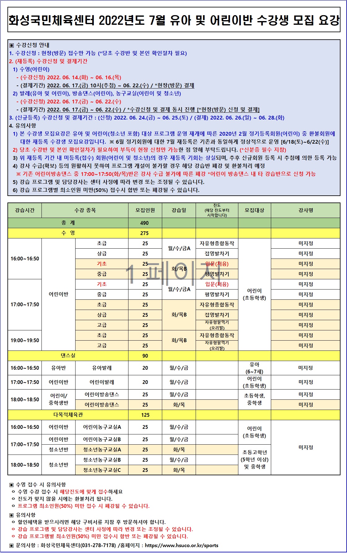 화성국민체육센터 화성국민체육센터 2022년도 7월 유아 및 어린이반 프로그램 수강생 모집요강 작성자 관리자 작성일 2022년 6월 9일 15시 57분 24초 조회 1,315 2022년도 7월 유아 및 어린이반 수강생 모집 요강.jpg [ Size : 667.78KB, Down : 1,894 ] 미리보기 다운로드 목록보기
