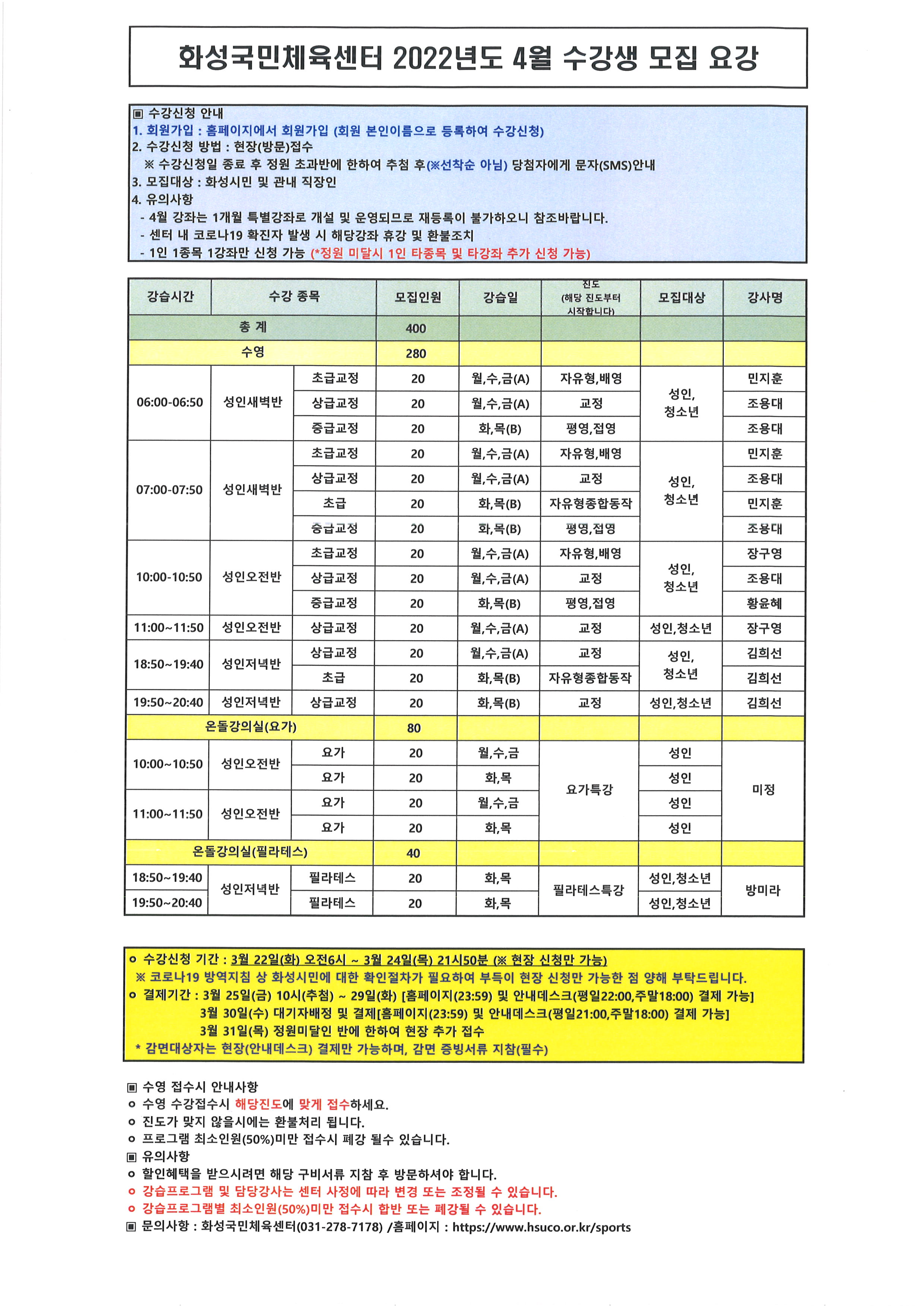 화성국민체육센터 화성국민체육센터 2022년도 4월 임시(특별)강좌 수강생 모집요강 작성자 관리자 작성일 2022년 3월 21일 14시 35분 1초 조회 1,966 2022년도 4월 모집요강.jpg [ Size : 950.44KB, Down : 3,266 ] 미리보기 다운로드 목록보기