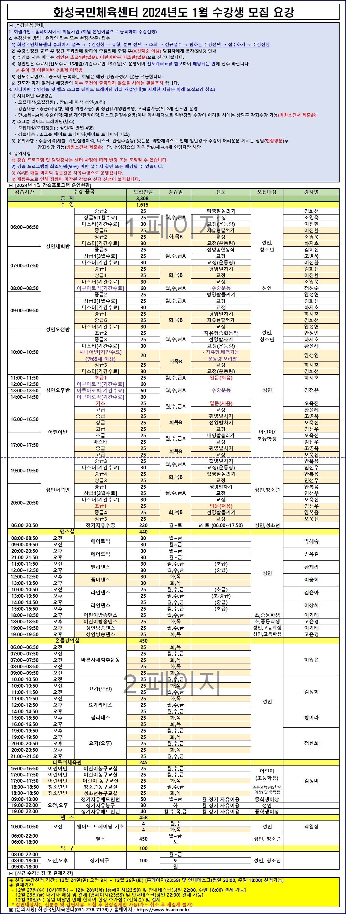 화성국민체육센터 화성국민체육센터 2024년도 1월 수강생 모집요강 작성자 관리자 작성일 2023년 12월 22일 17시 37분 12초 조회 3,853 2024년 1월 화성국민체육센터 프로그램 모집요강.jpg [ Size : 1.28MB, Down : 7,932 ] 미리보기 다운로드 목록보기