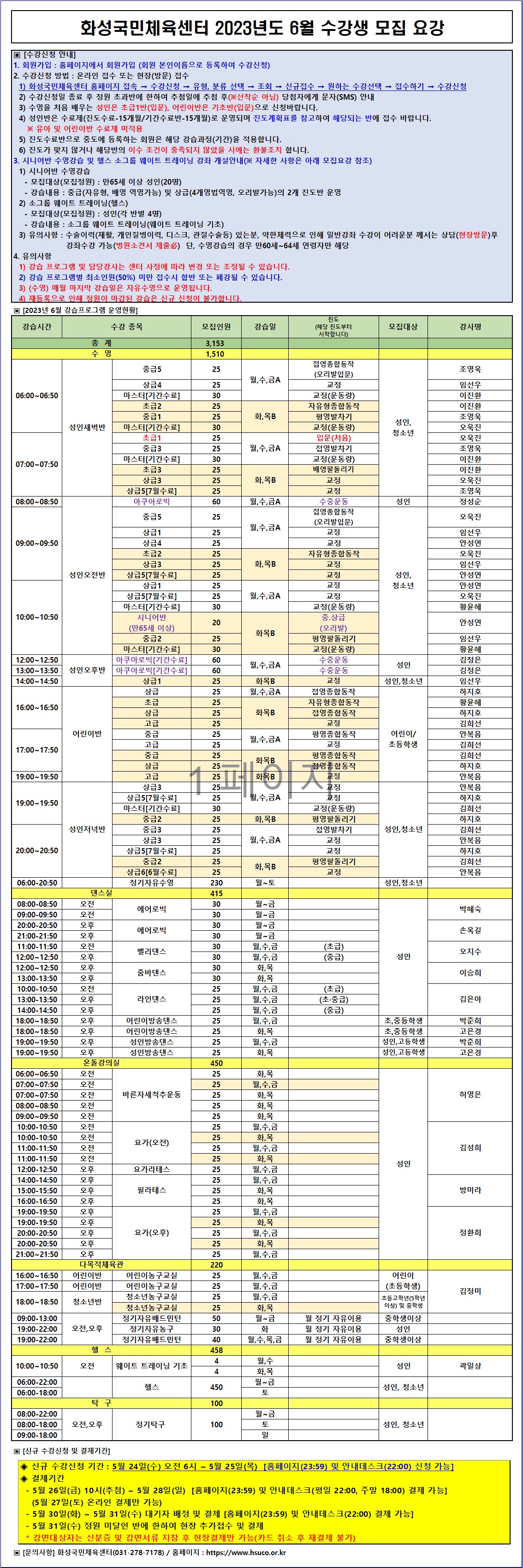 화성국민체육센터 화성국민체육센터 2023년 6월 수강생 모집요강 작성자 관리자 작성일 2023년 5월 23일 15시 16분 56초 조회 3,875 화성국민체육센터 2023년도 6월 수강생 모집요강.jpg [ Size : 1.32MB, Down : 7,118 ] 미리보기 다운로드 목록보기
