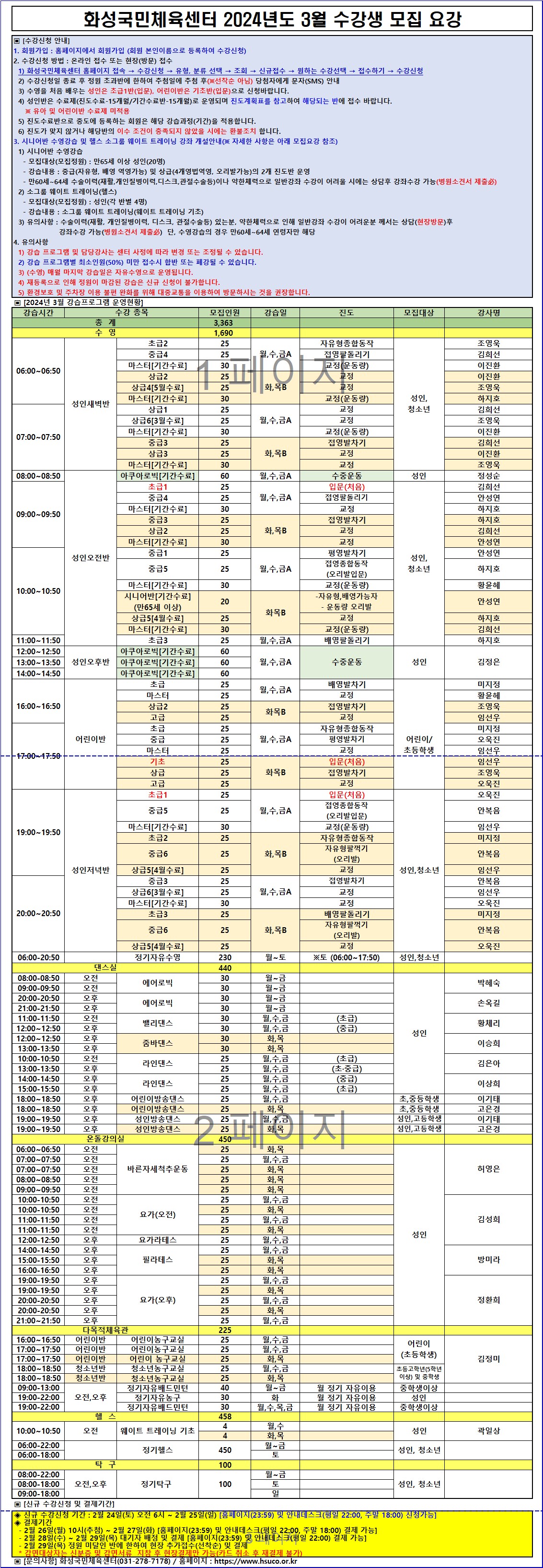 화성국민체육센터 화성국민체육센터 2024년도 3월 수강생 모집요강 작성자 관리자 작성일 2024년 2월 23일 9시 0분 2초 조회 3,167 2024년도 3월 화성국민체육센터 프로그램 모집요강.jpg [ Size : 1.12MB, Down : 6,141 ] 미리보기 다운로드 목록보기