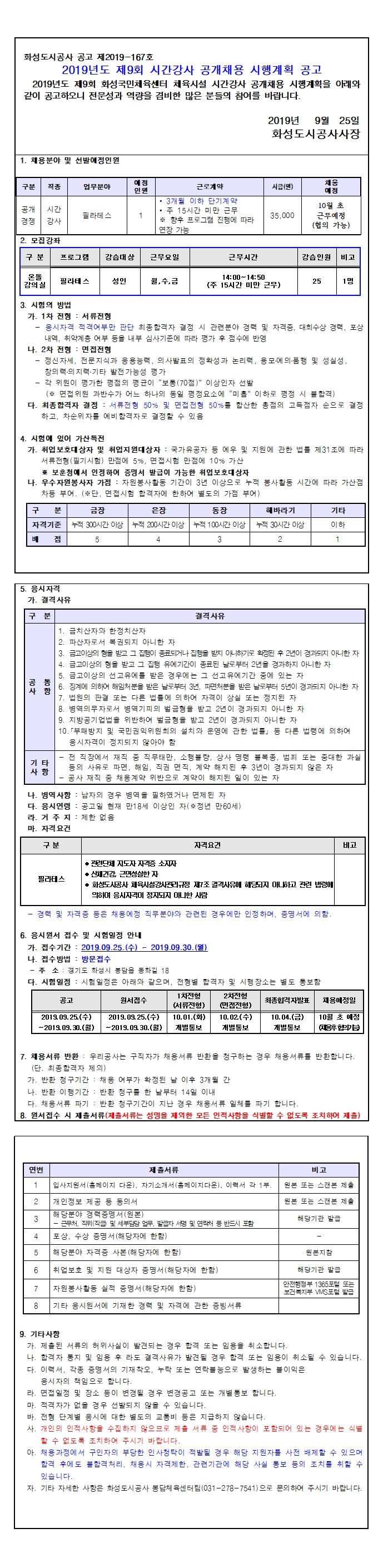 화성국민체육센터 2019년도 제9회 시간강사 공개채용 시행계획 공고 작성자 관리자 작성일 2019년 9월 25일 9시 20분 33초 조회 781 1. 공고문.hwp [ Size : 24KB, Down : 671 ] 다운로드 입사지원서, 자기소개서.hwp [ Size : 32KB, Down : 627 ] 다운로드 개인정보 수집이용제공 동의서.hwp [ Size : 13.5KB, Down : 621 ] 다운로드 채용서류 반환청구서.hwp [ Size : 15.5KB, Down : 673 ] 다운로드 2019년 제9회 시간강사 공개채용 시행계획 공고.jpg [ Size : 1.18MB, Down : 674 ] 미리보기 다운로드 목록보기
