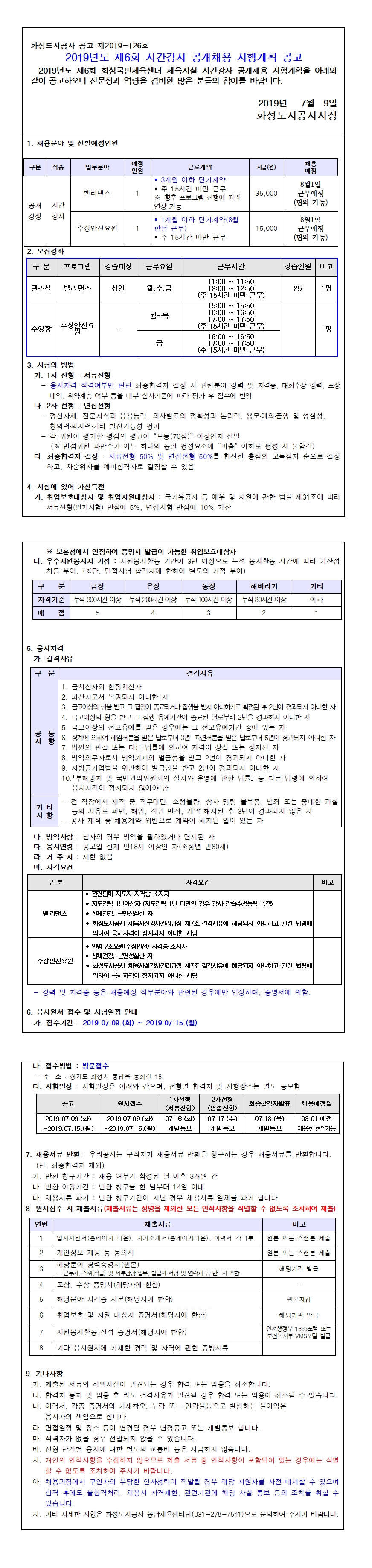 화성국민체육센터 2019년도 제6회 시간강사 공개채용 시행계획 공고 작성자 관리자 작성일 2019년 7월 9일 9시 38분 7초 조회 1,079 1. 공고문.hwp [ Size : 32KB, Down : 821 ] 다운로드 입사지원서, 자기소개서.hwp [ Size : 32KB, Down : 805 ] 다운로드 개인정보 수집이용제공 동의서.hwp [ Size : 13.5KB, Down : 772 ] 다운로드 채용서류 반환청구서.hwp [ Size : 15.5KB, Down : 782 ] 다운로드 공고문.jpg [ Size : 1.7MB, Down : 1,131 ] 미리보기 다운로드 목록보기