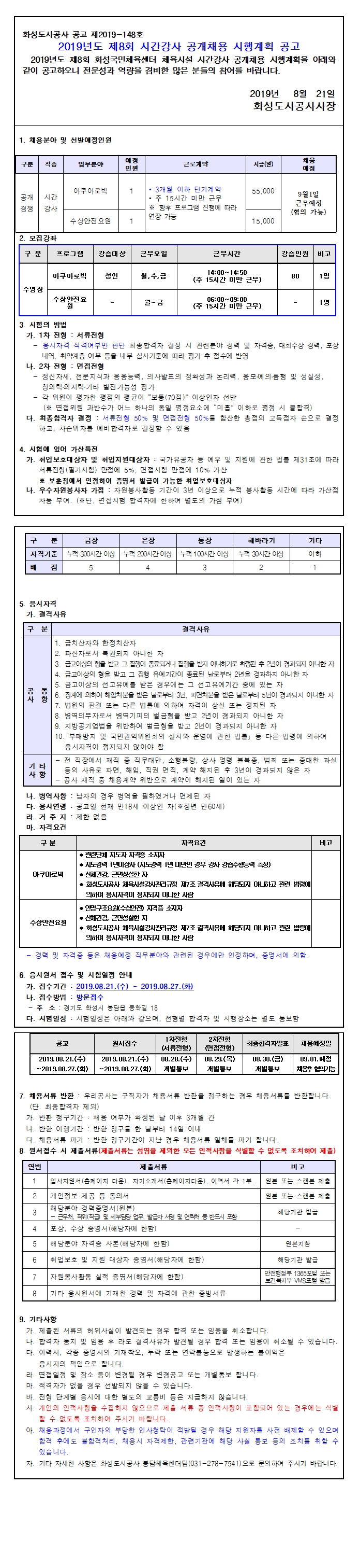 화성국민체육센터 2019년도 제8회 시간강사 공개채용 시행계획 공고 작성자 관리자 작성일 2019년 8월 21일 9시 44분 37초 조회 1,084 1. 공고문.hwp [ Size : 24.5KB, Down : 673 ] 다운로드 입사지원서, 자기소개서.hwp [ Size : 32KB, Down : 630 ] 다운로드 개인정보 수집이용제공 동의서.hwp [ Size : 13.5KB, Down : 603 ] 다운로드 채용서류 반환청구서.hwp [ Size : 15.5KB, Down : 627 ] 다운로드 공고문.jpg [ Size : 1.26MB, Down : 1,086 ] 미리보기 다운로드 목록보기