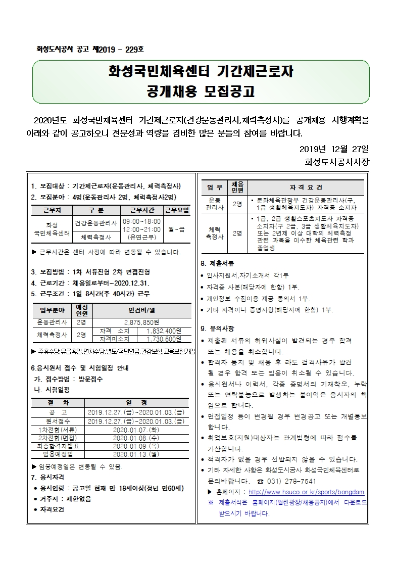 화성국민체육센터 화성국민체육센터 기간제근로자 공개채용 모집공고 작성자 관리자 작성일 2019년 12월 27일 16시 45분 20초 조회 876 1. 공고문.hwp [ Size : 20KB, Down : 720 ] 다운로드 2. 입사지원서, 자기소개서.hwp [ Size : 19KB, Down : 686 ] 다운로드 3. 개인정보 수집이용제공 동의서.hwp [ Size : 13.5KB, Down : 653 ] 다운로드 4. 채용서류 반환청구서.hwp [ Size : 15.5KB, Down : 644 ] 다운로드 공고문.jpg [ Size : 499KB, Down : 1,042 ] 미리보기 다운로드 목록보기