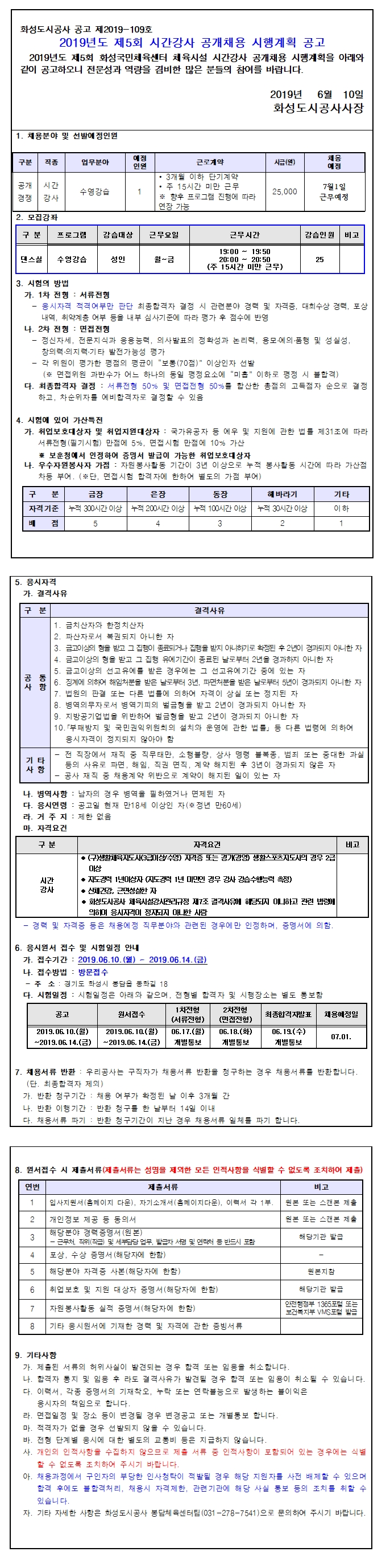 화성국민체육센터 2019년도 제5회 시간강사 공개채용 시행계획 공고 작성자 관리자 작성일 2019년 6월 11일 10시 14분 12초 조회 735 1. 공고문.hwp [ Size : 24KB, Down : 684 ] 다운로드 입사지원서, 자기소개서.hwp [ Size : 32KB, Down : 695 ] 다운로드 개인정보 수집이용제공 동의서.hwp [ Size : 13.5KB, Down : 661 ] 다운로드 채용서류 반환청구서.hwp [ Size : 15.5KB, Down : 693 ] 다운로드 제5회 공개채용.jpg [ Size : 1.2MB, Down : 713 ] 미리보기 다운로드 목록보기