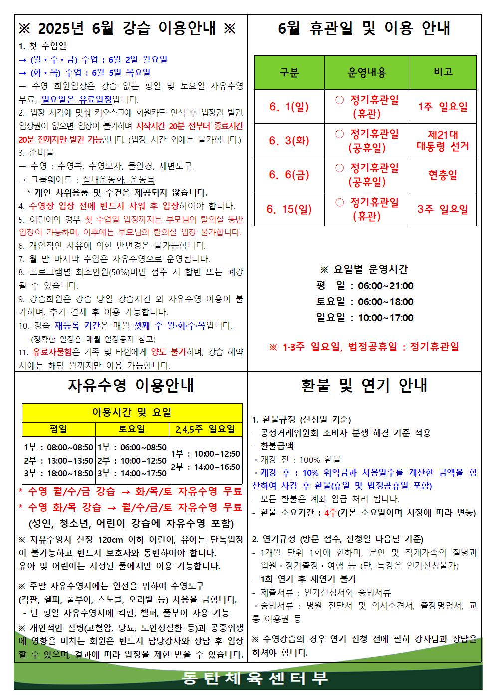 동탄중앙어울림센터 2025년 6월 휴관일 및 이용안내 작성자 관리자 작성일 2025년 5월 27일 14시 14분 58초 조회 1,408 2025년 6월 휴관일 및 이용안내.jpg [ Size : 301.19KB, Down : 1,852 ] 미리보기 다운로드 목록보기
