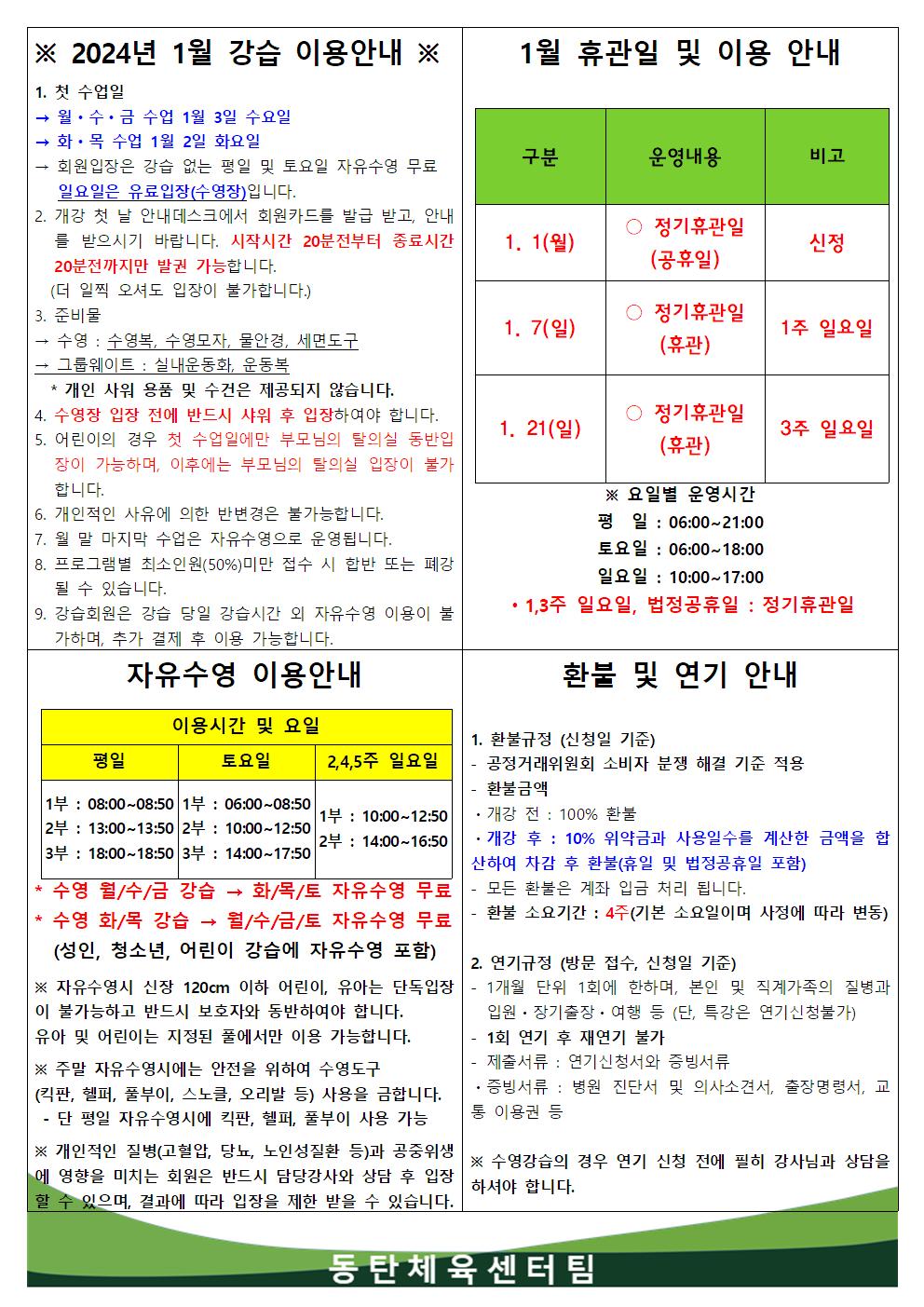 동탄중앙어울림센터 2024년 1월 휴관일 및 이용안내 작성자 관리자 작성일 2023년 12월 27일 14시 8분 14초 조회 932 2024년 1월 강습이용안내001.jpg [ Size : 281.25KB, Down : 1,003 ] 미리보기 다운로드 목록보기
