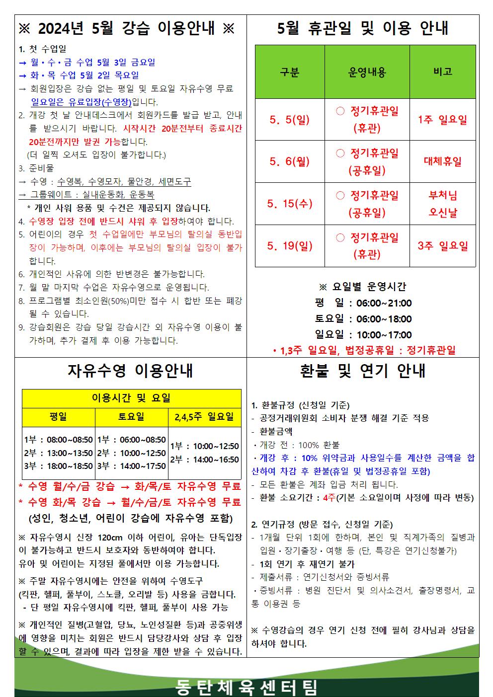 동탄중앙어울림센터 2024년 5월 휴관일 및 이용안내 작성자 관리자 작성일 2024년 4월 26일 9시 54분 50초 조회 1,557 2024년 5월 강습이용안내001.jpg [ Size : 285.41KB, Down : 1,986 ] 미리보기 다운로드 목록보기
