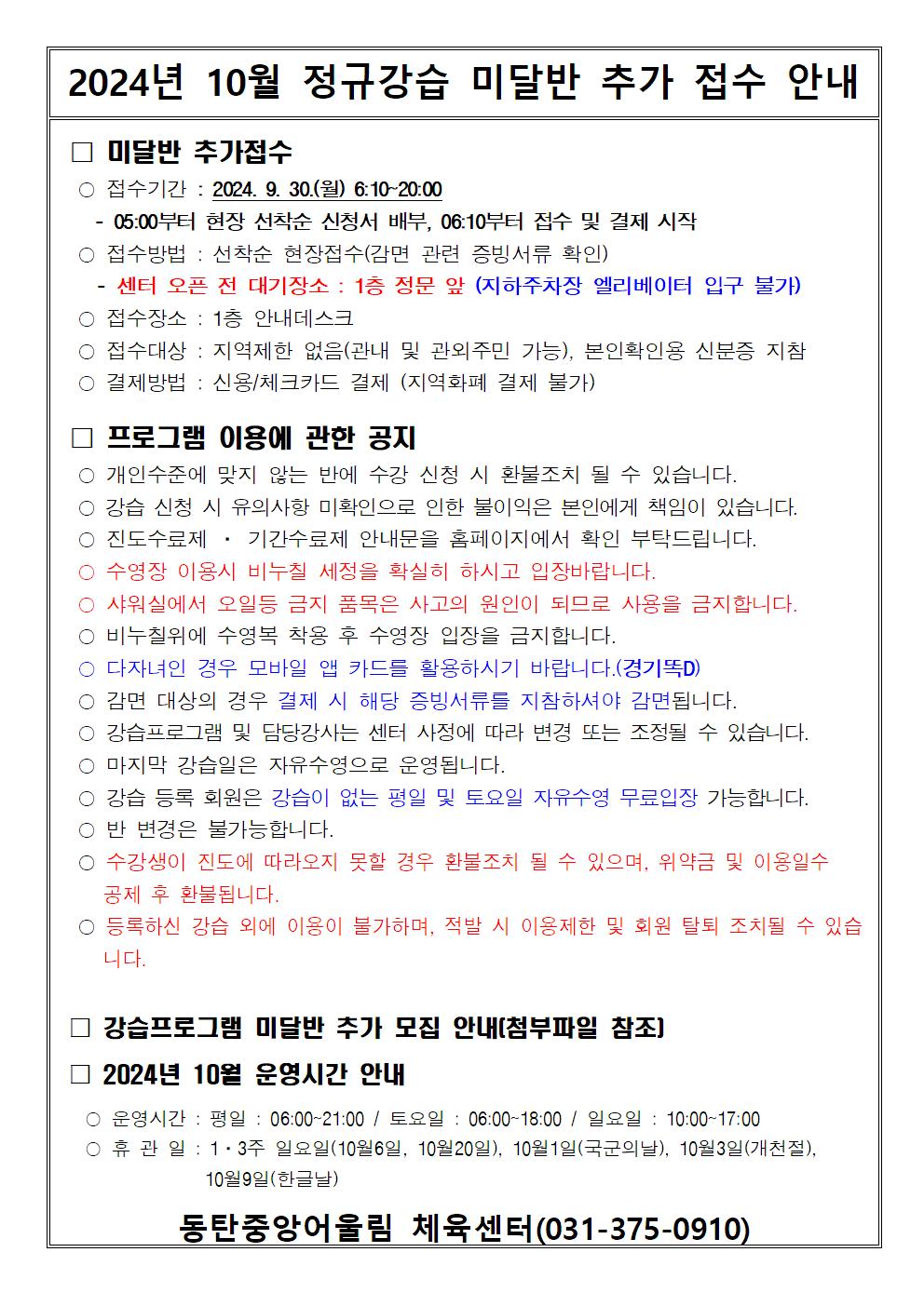 동탄중앙어울림센터 2024년 10월 정규강습 미달반 추가 모집안내 작성자 관리자 작성일 2024년 9월 27일 14시 24분 54초 조회 2,098 2024년 10월 정규강습 미달반 추가 접수 안내.jpg [ Size : 226.19KB, Down : 2,961 ] 미리보기 다운로드 10월 미달반.jpg [ Size : 41.57KB, Down : 2,985 ] 미리보기 다운로드 9월30일 접수기간 마감 이후 10월 강습 추가 모집 없습니다.자세한 사항은 아래 공고문 확인바랍니다. 목록보기