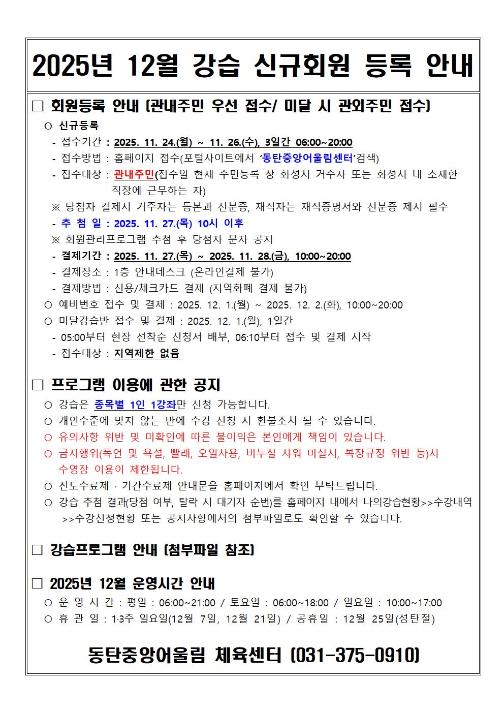 동탄중앙어울림센터 2025년 12월 정규강습 신규회원 모집 안내